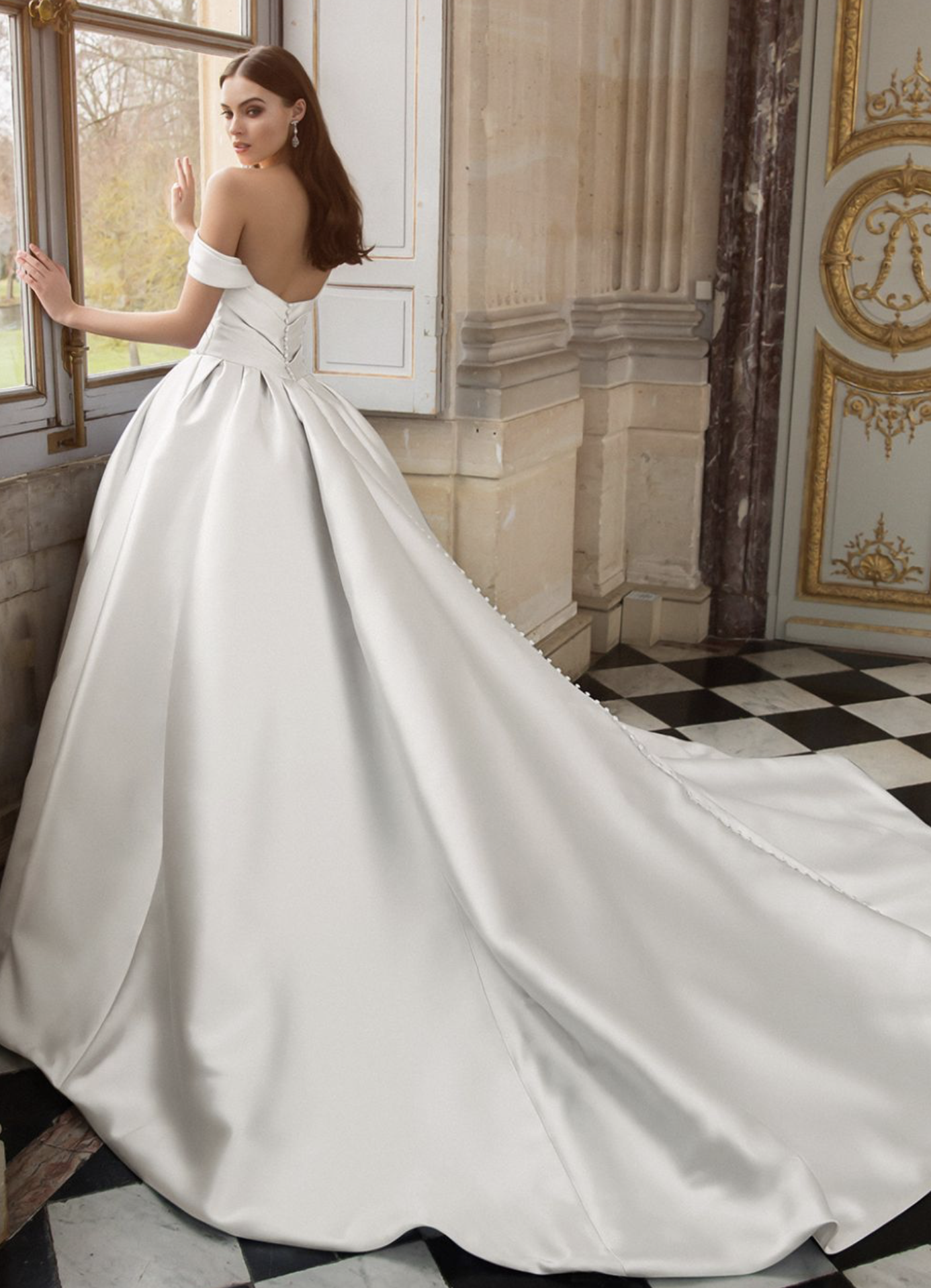 This ultra-fairytale gown is a timeless Mikado ball gown with an exquisite draped bodice and a sexy high slit for a super flattering look. The 3D floral appliques on the off-shoulder sleeves add extra charm and romance to this dream dress that would make even Cinderella jealous. And did we mention that ASTOR comes with pockets?