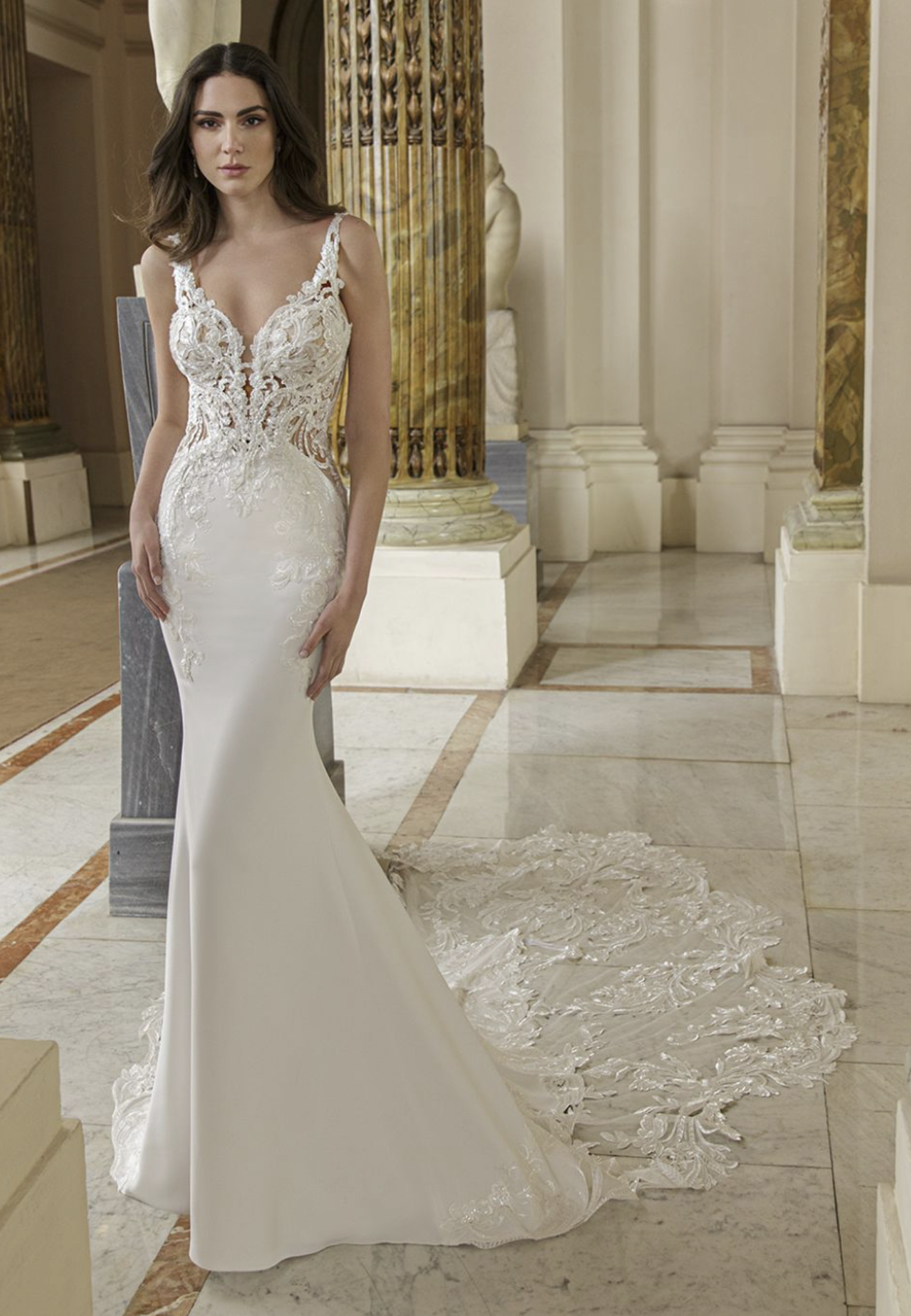 This stunning, sexy stretch georgette mermaid wedding dress has twinkling beaded floral lace, baroque lace and sparkling Chantilly lace on the classic illusion bodice leading down to the beautiful side cut-outs trickling down to a sultry skirt with a signature ÉLYSÉE cut-out train with sculpted hem.