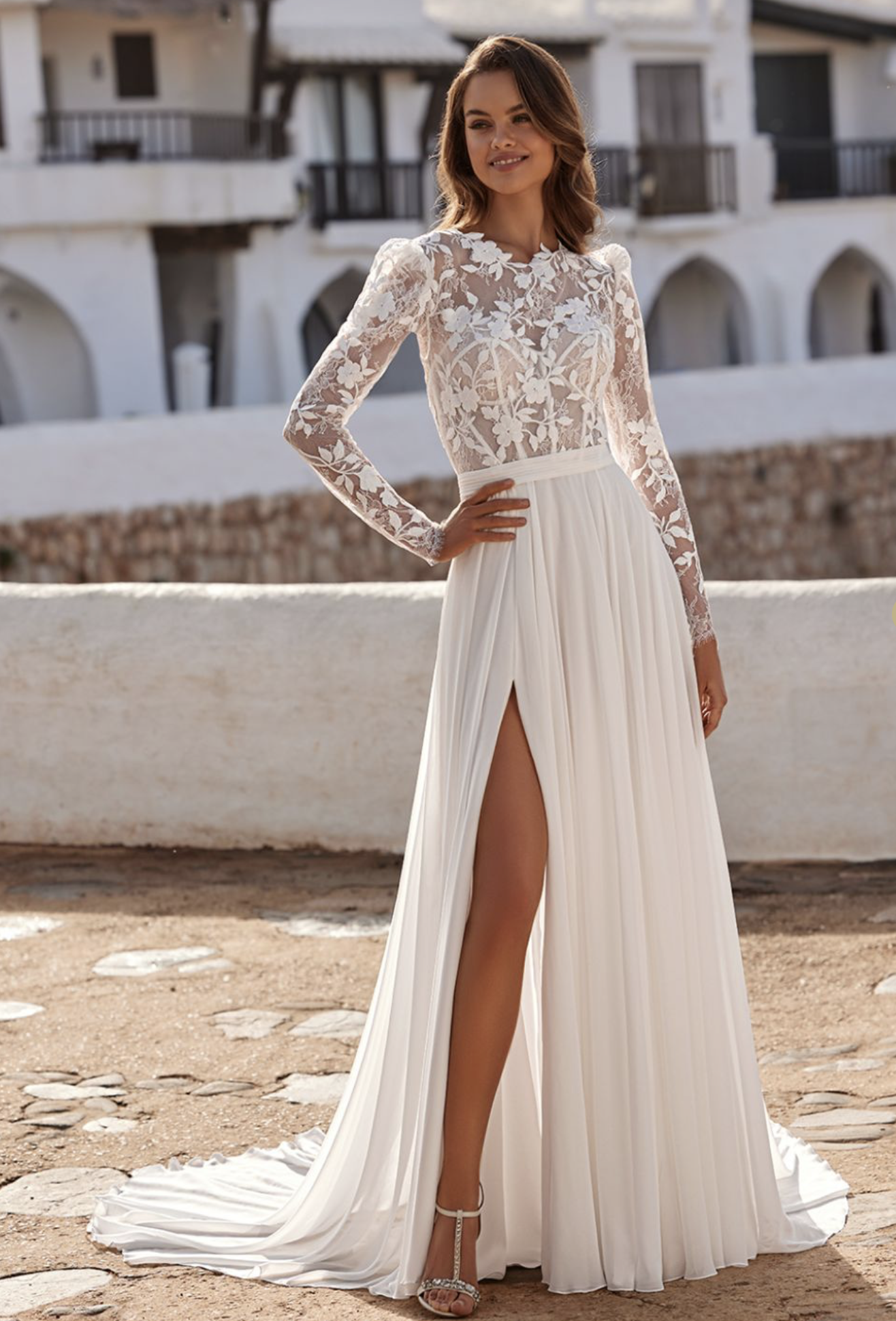 The DANA gown features a mesmerizing bodice adorned with delicate floral embroidered lace and Chantilly lace, exuding regal sophistication. The ethereal combination of tulle and chiffon in the skirt creates a whimsical silhouette that floats with grace and movement. Its lace long sleeves, complemented by its puff shoulder detailing and a high neckline, add a vintage spin on this modern gown.