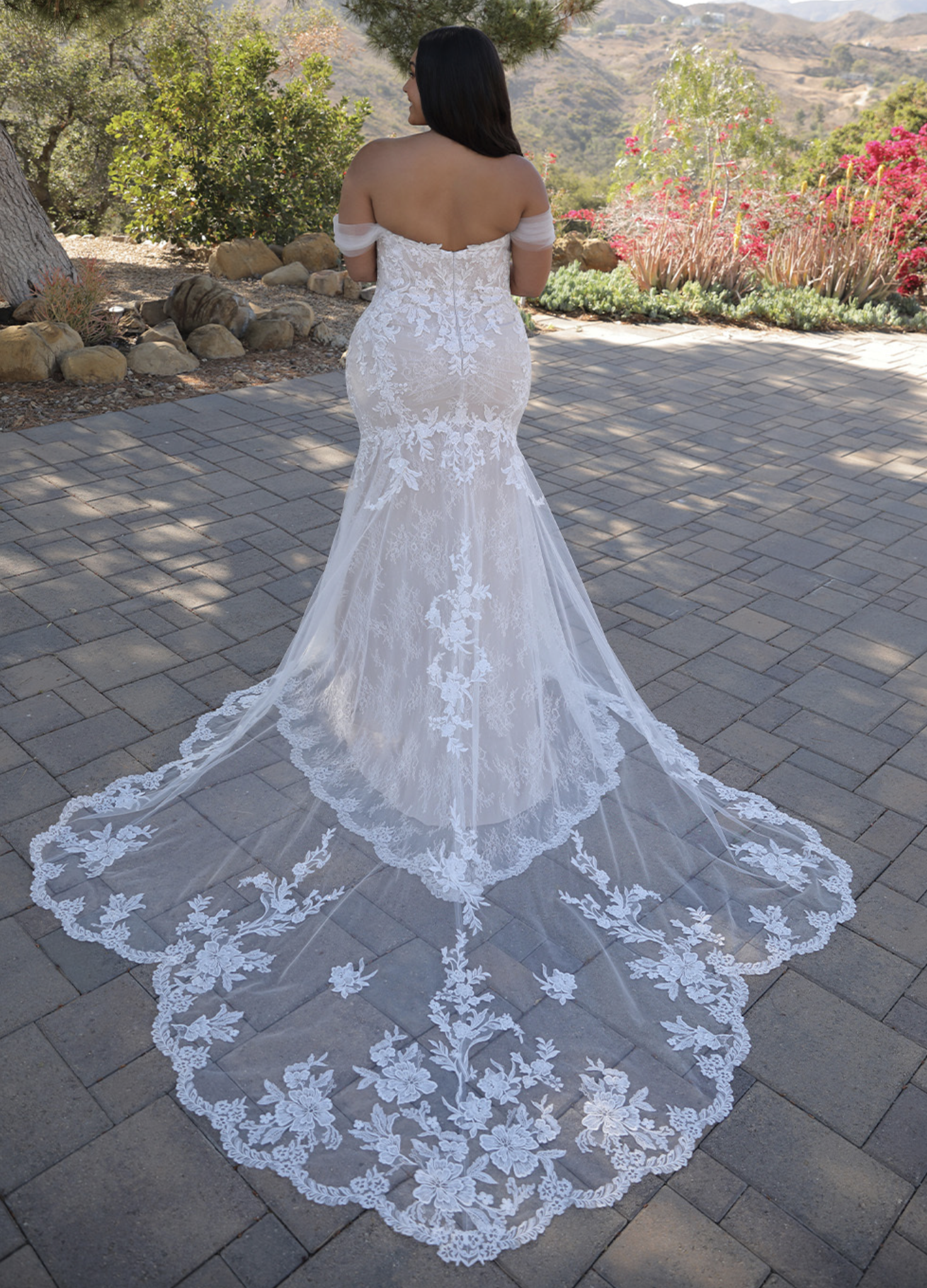 Detachable off-shoulder straps are a romantic and versatile element detail on this mermaid gown with floral embroidered lace, Chantilly lace, and tulle. A fully lined bodice and soft, stretch jersey lining ensures comfort and body-contouring support, while a signature sculpted hem brings all the drama and elegance.