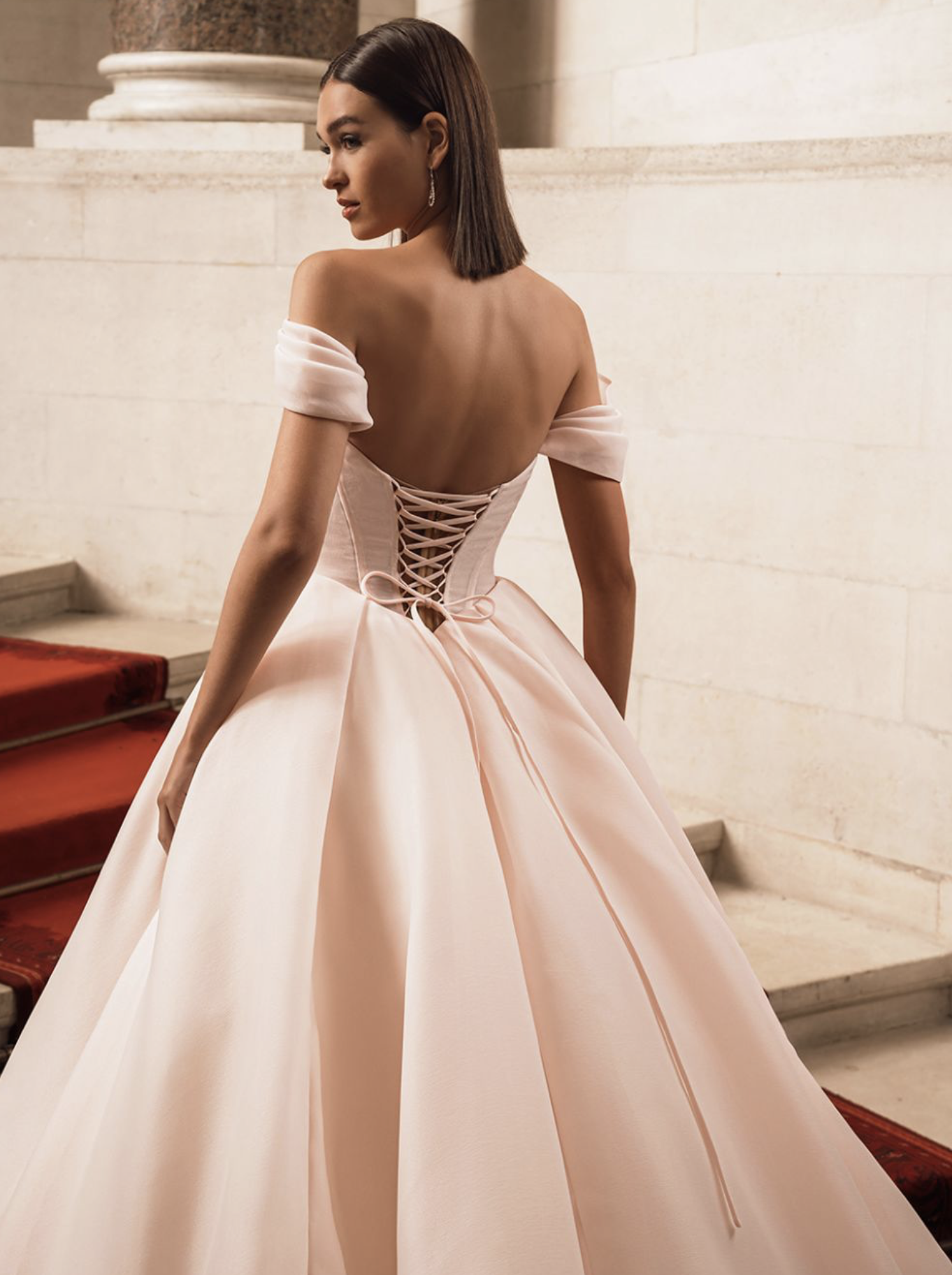 Pretty in pink! Stun your guests with a gorgeous blush organza ball gown look. FILIPPA showcases romantic draping all over the sweetheart neckline bodice with delicate detachable off-shoulder straps. The flattering basque waistline with the breathtaking skirt and high slit, along with the corset back with sweet bow detail make FILIPPA the most picture-perfect fairytale wedding dress.