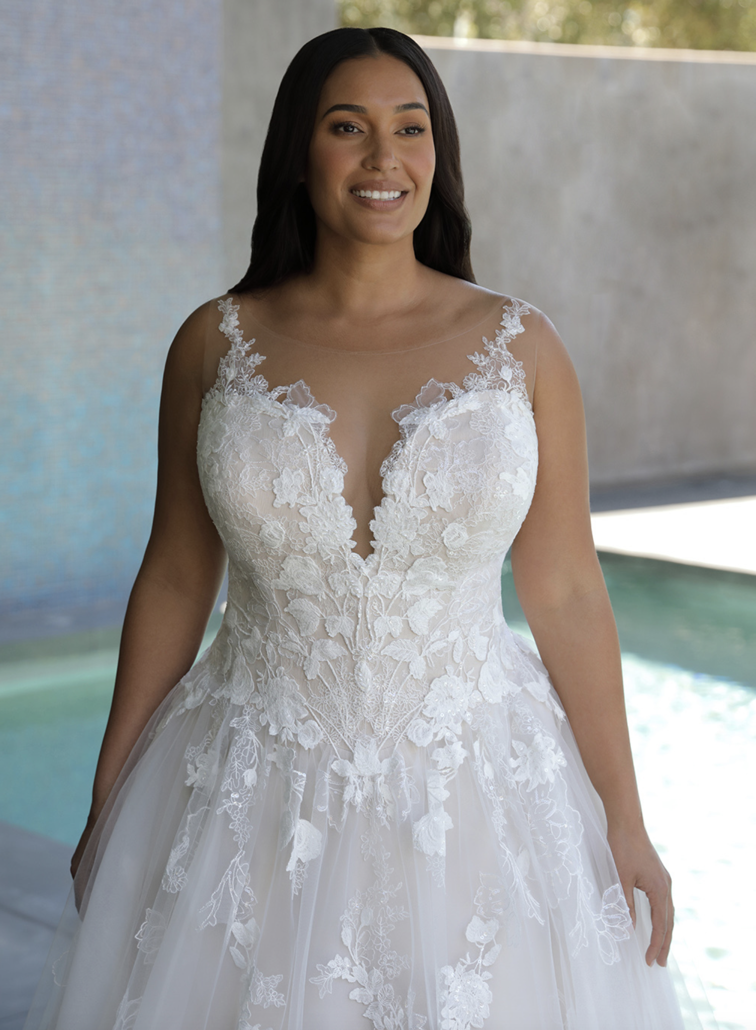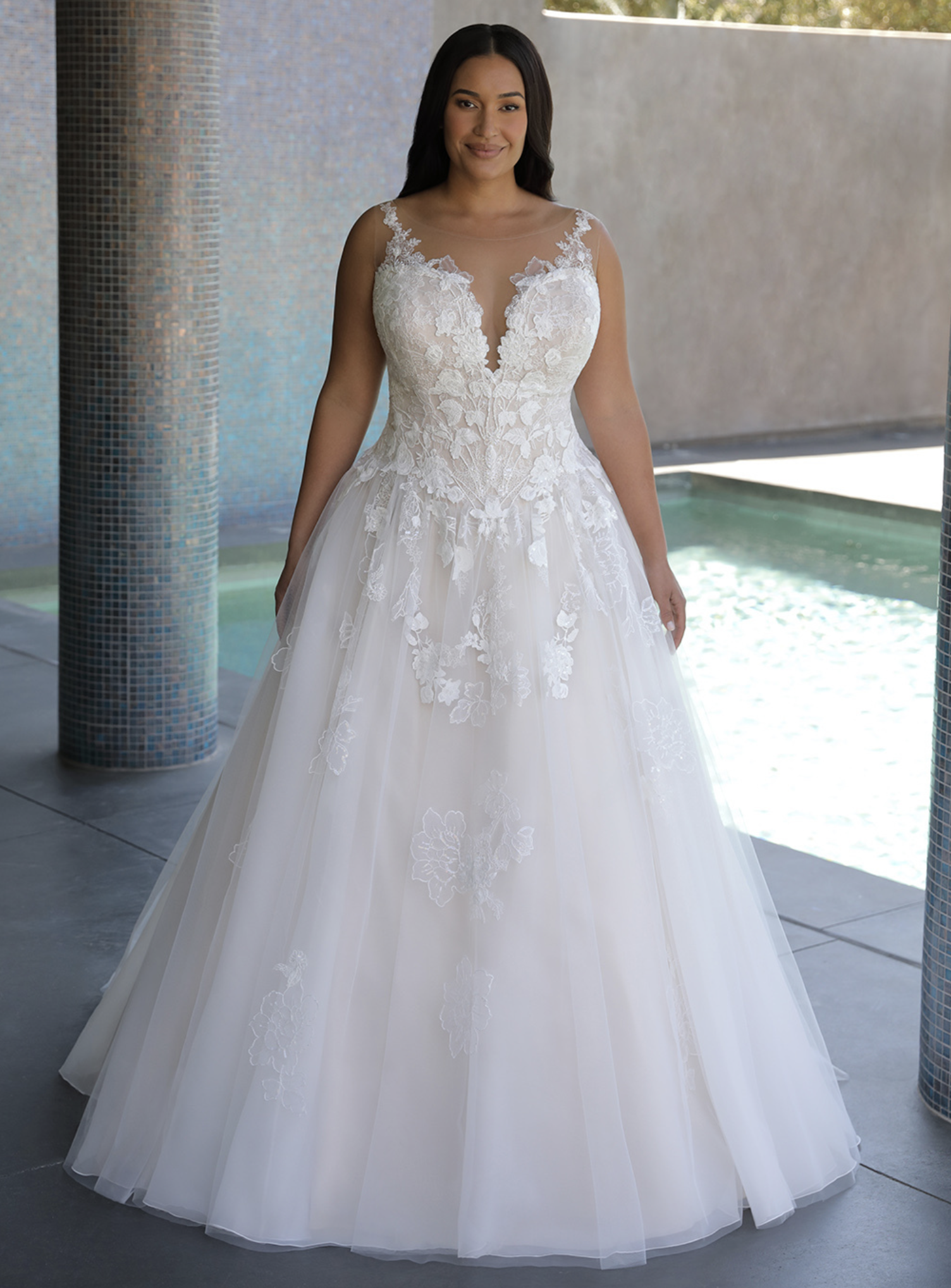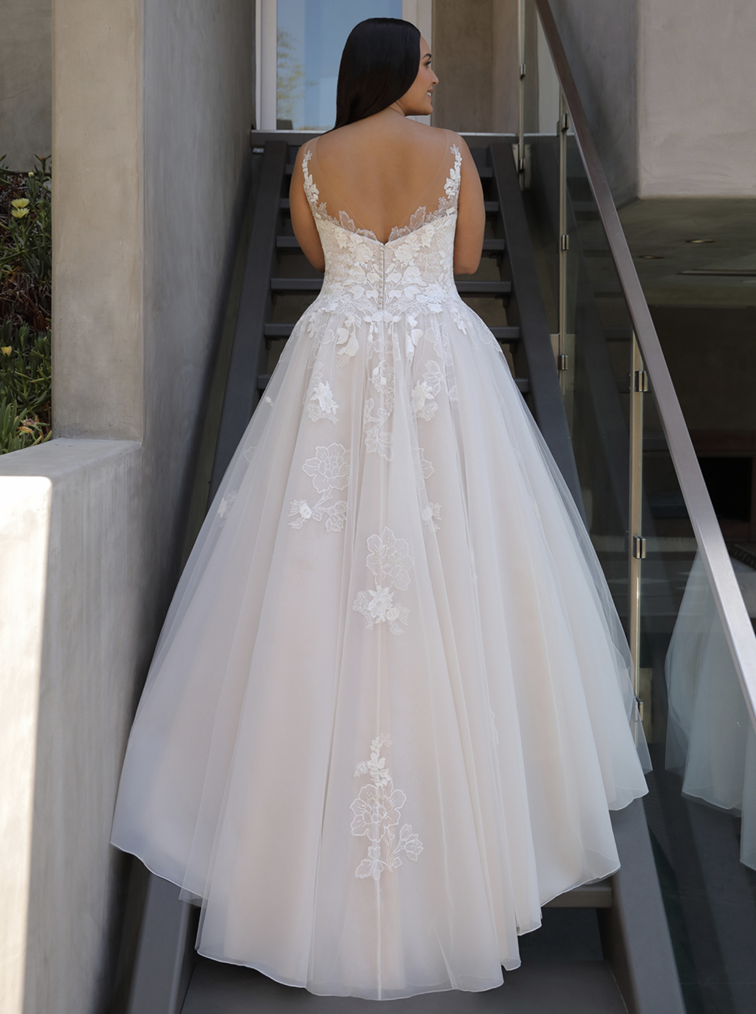 Gorgeous and romantic, this A-line beauty features multiple layers of dimensional embroidered, sparkling floral laces as well as a fully lined bodice with thoughtfully designed dropped waist and high back to elongate the torso and enhance the dreamy, full skirt.