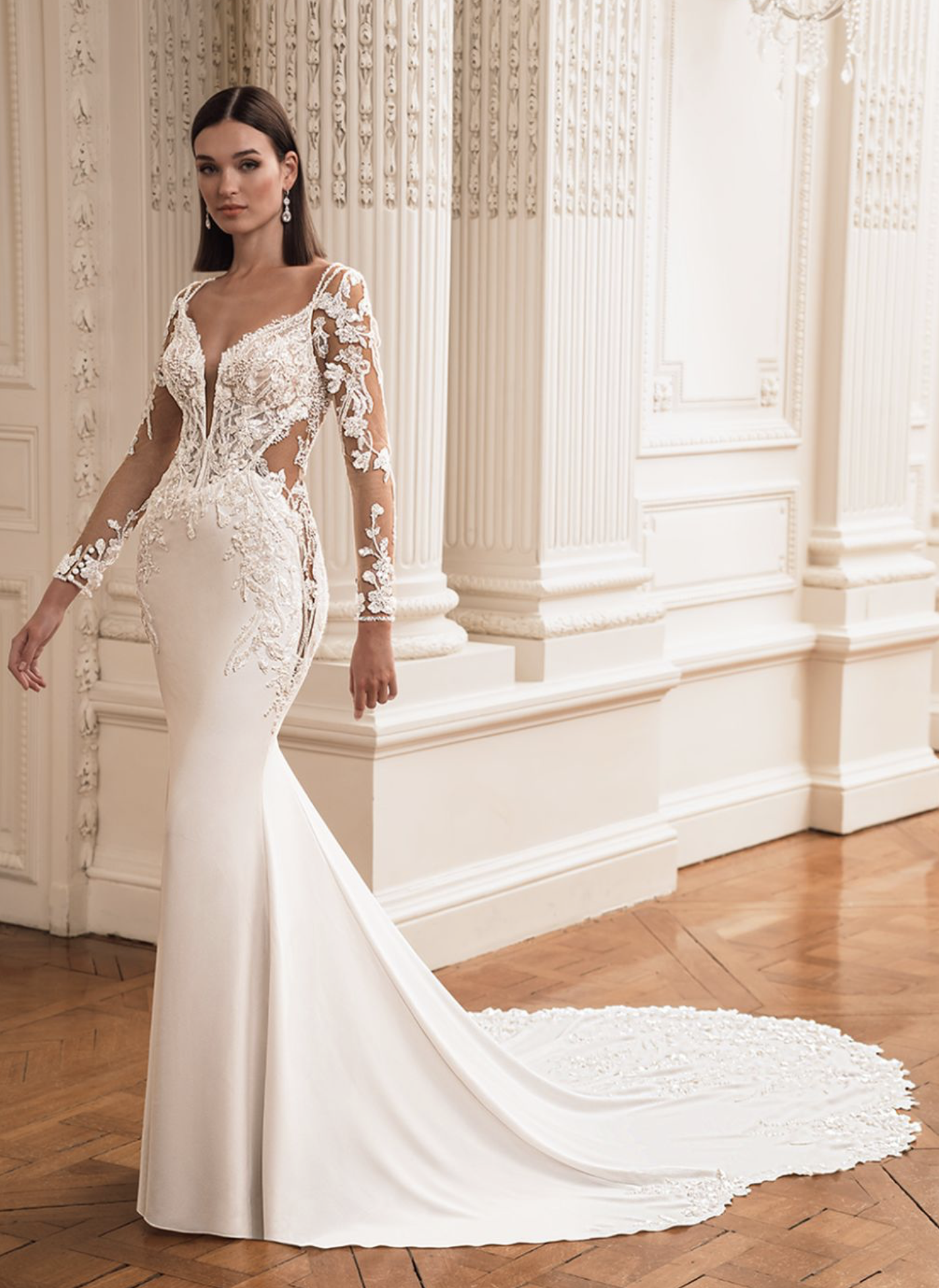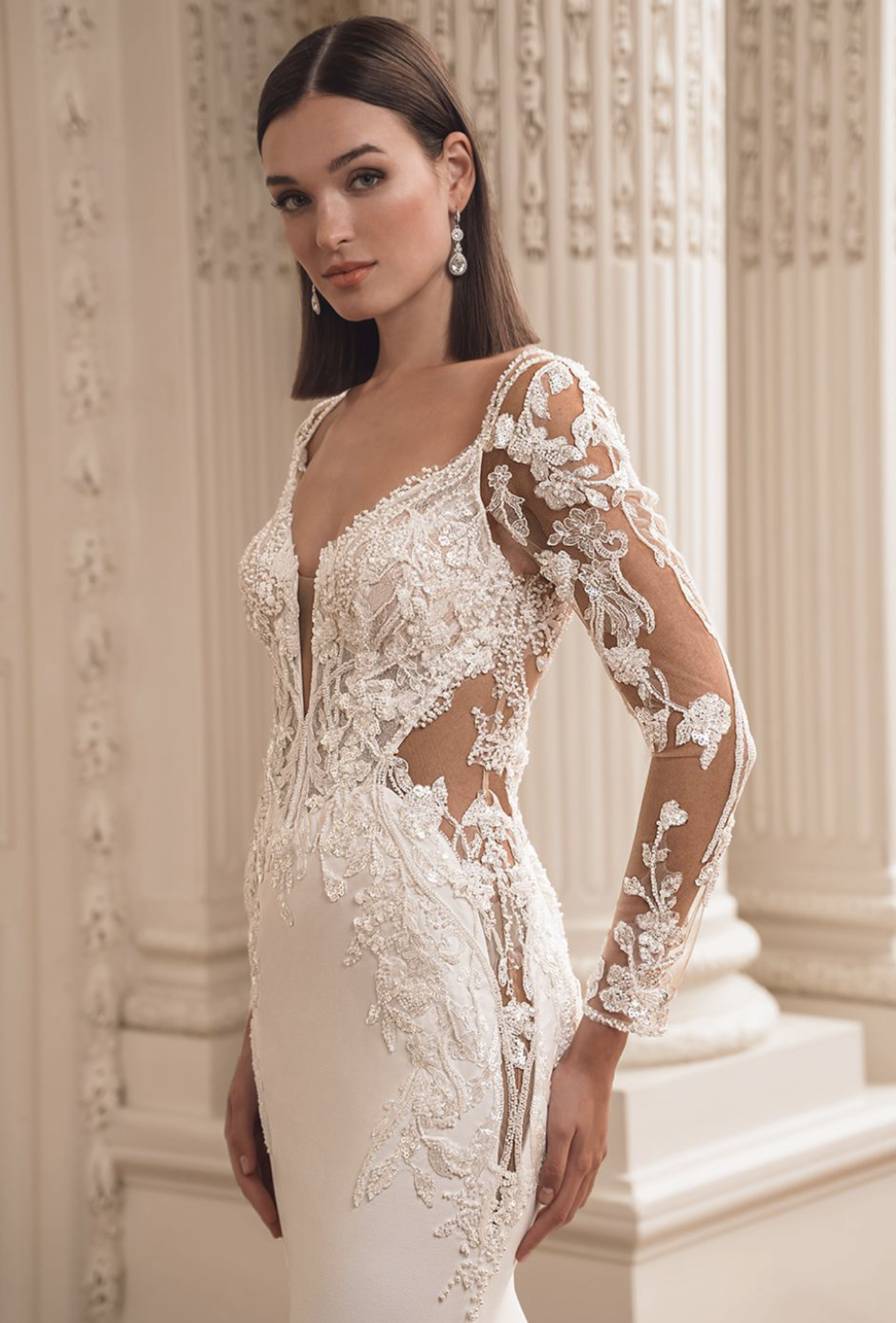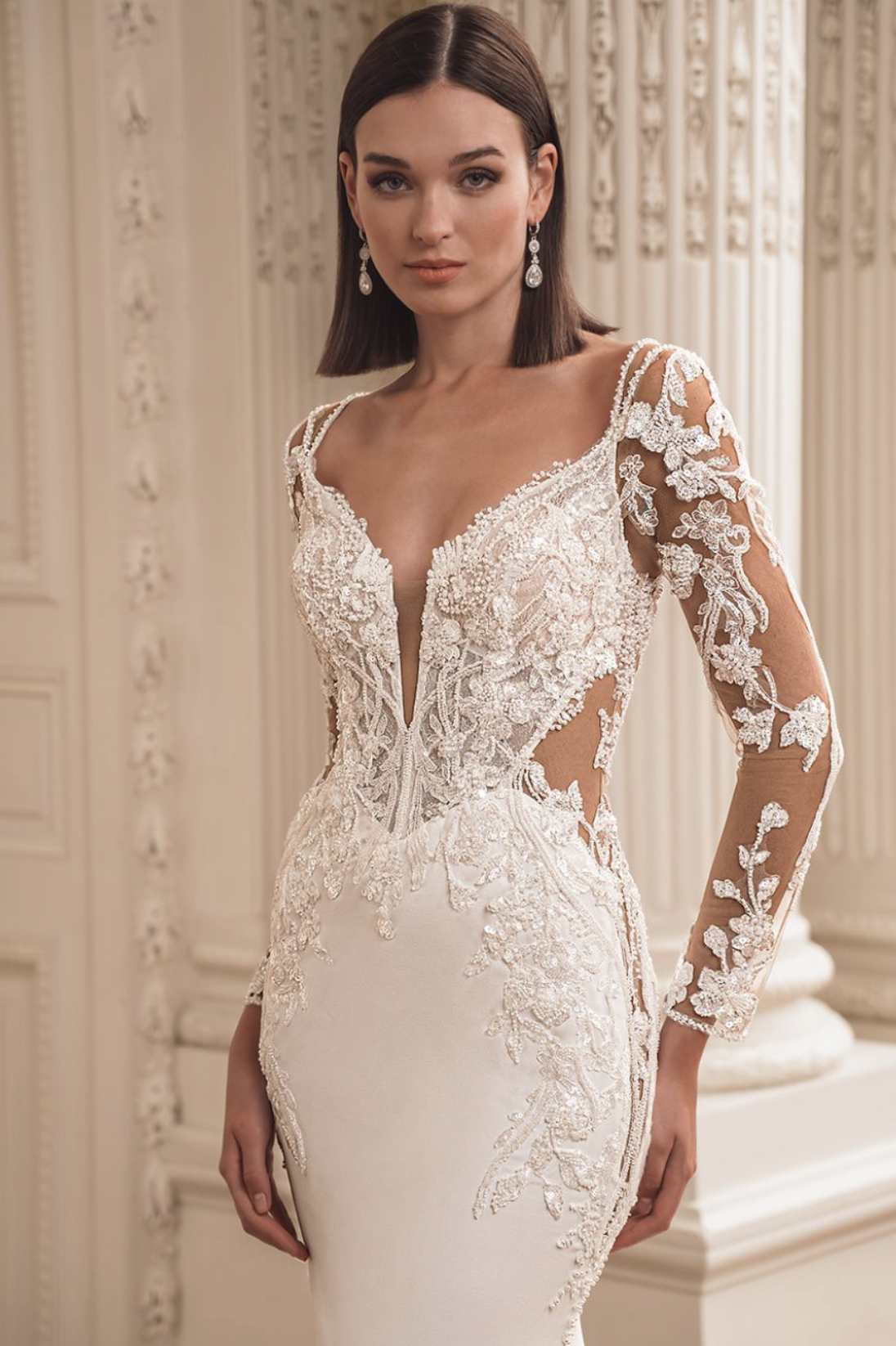 FLORA exudes sophistication and elegance with its beaded floral deep V-neckline and detachable long sleeves. The sparkling bodice with illusion side cut-outs gives this gown the perfect touch of sultry sophistication to the classic mermaid silhouette, making it the perfect choice for a modern bride.