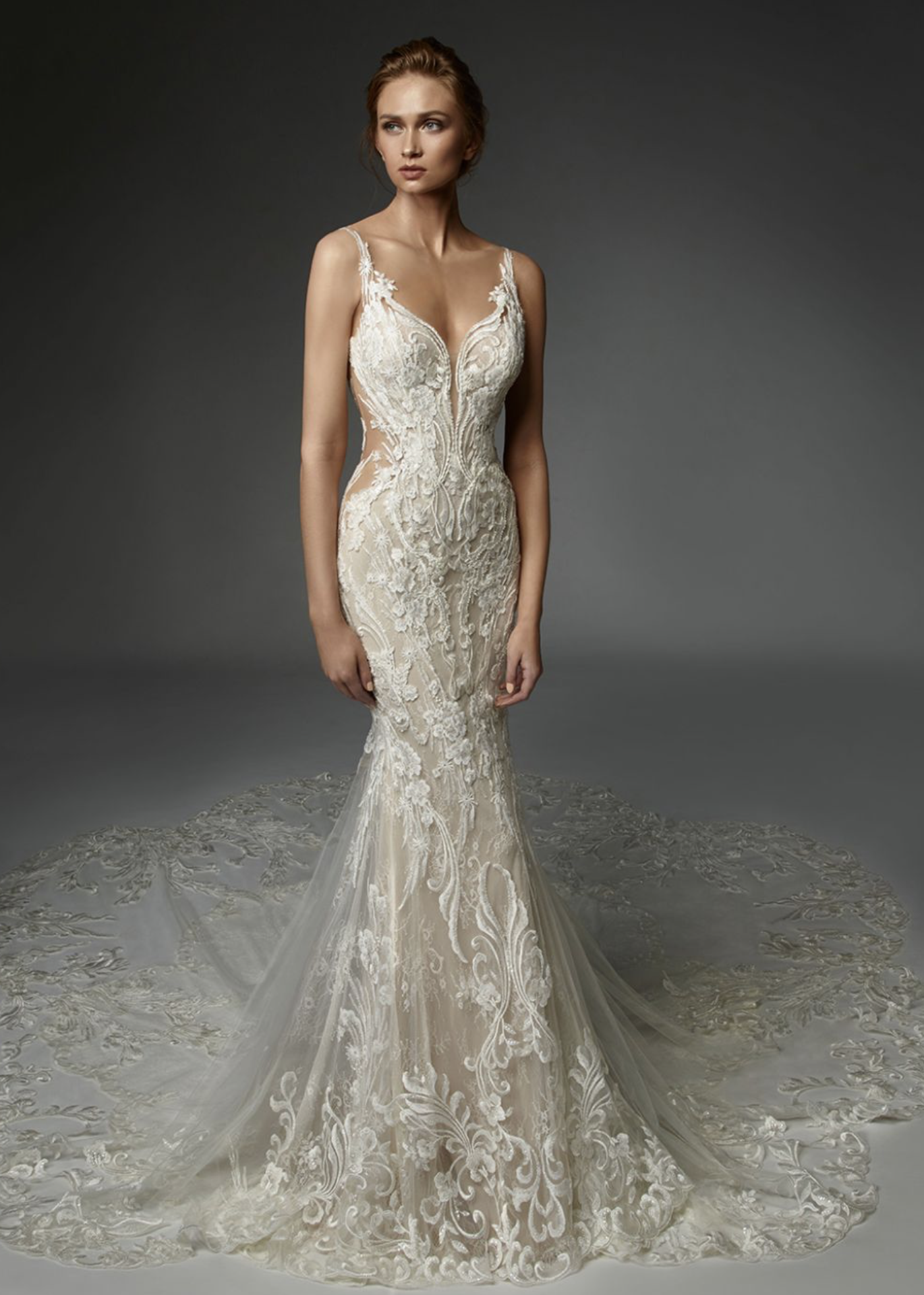 Floral, baroque lace with thousands of hand-embroidered beads and palettes sparkles over delicate French Chantilly lace, curving gracefully around the body to contour and elongate the silhouette. Figure-flattering, deep side cutouts reveal a subtle hint of skin, while a double layer, sculpted baroque lace train completes this dramatic look.