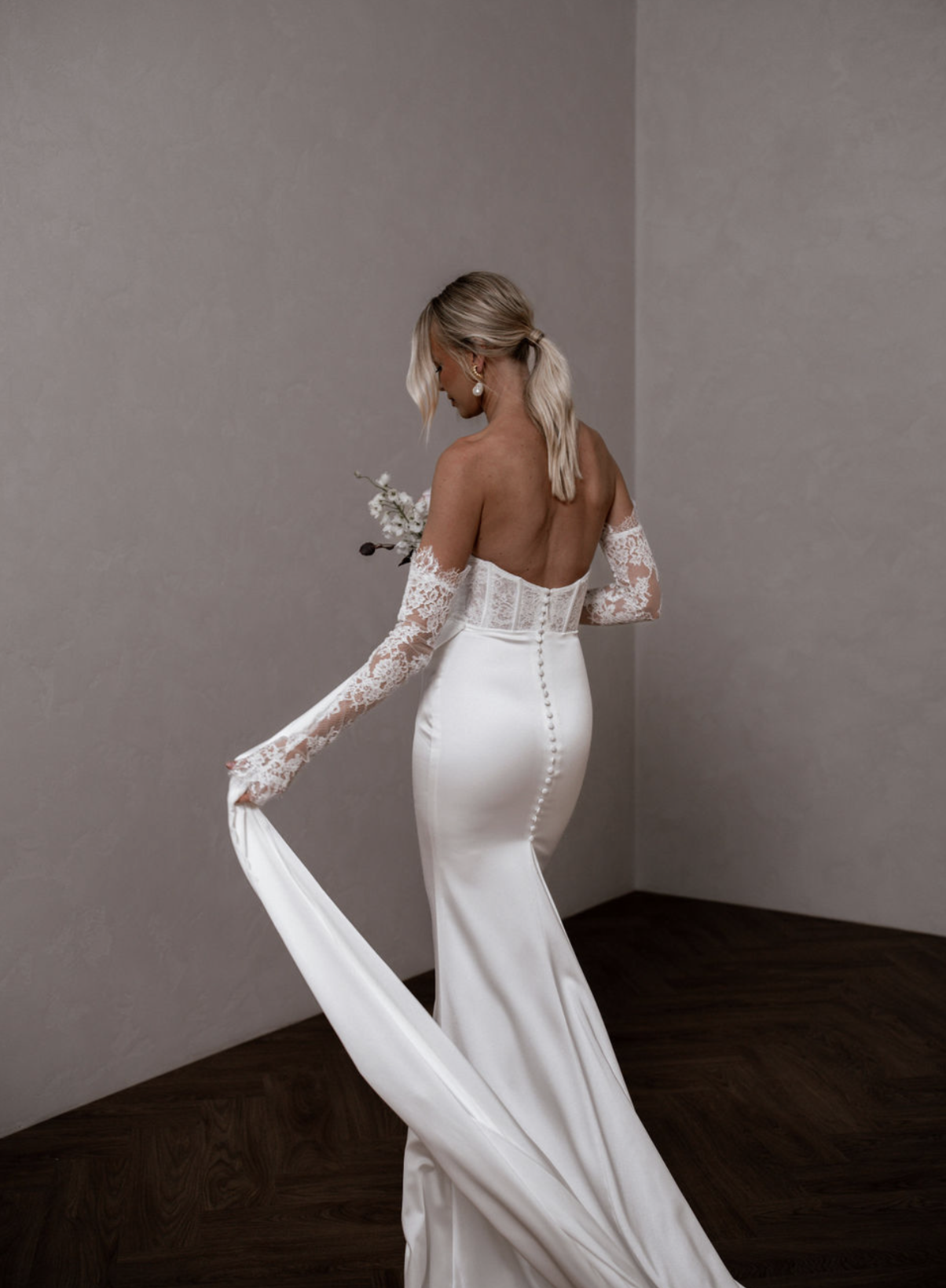 The modern bodice shape and lace detailing adds an element of romance, seamlessly paired with the perfect skirt designed to flatter and move with you, offering a graceful, figure-enhancing shape that will leave you feeling nothing short of stunning. Attach her removable side train for the bride who wants an extra touch of detail.