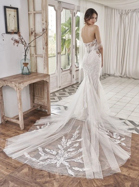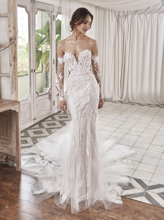 Be the center of attention in ALLIE. This captivating mermaid gown showcases a mesmerizing 3D laser cut floral blossom embroidered lace that continues into its chic tulle train. Its sweetheart strapless neckline guides the eye to its delicate, detachable tulle and lace long sleeves layered underneath detachable off-the-shoulder tulle straps that uniquely criss-cross in the back. The glitter tulle that can be seen throughout the dress adds in extra glamour to this flirty floral moment.
