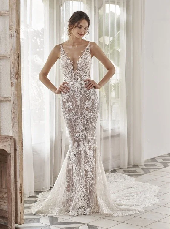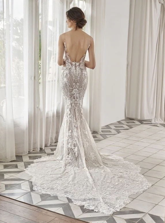 ANGELINA will be sure to stun with all of its breathtaking details. This decadent mermaid gown has embellished straps that cascade into a deep V-neckline, illusion low back, and glittering beaded 3D floral motifs. The combination of romantic botanical lace and modern, beaded linear lace is perfectly complemented by its sparkling glitter tulle and soft stretch chiffon. This gown will have you glowing on your wedding day.