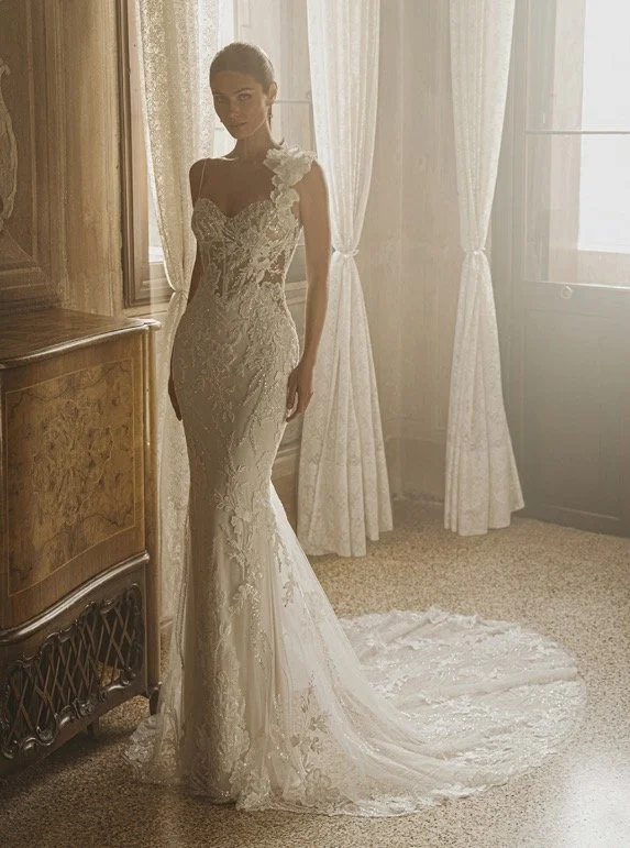 CORDELIA is here to captivate hearts with its sparkling floral embroidered lace sheath silhouette, showcasing a romantic one-shoulder neckline adorned with a bold flower accent and beaded 3D floral embroidered appliques. The intricate beaded swirl lace and floral overlay adds dimension and texture, while the soft tulle and jersey lining ensures effortless glam and ease of movement.
