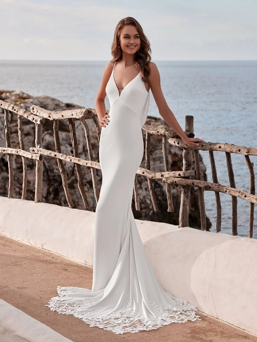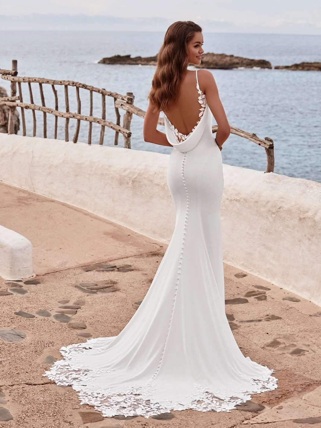 With clean lines and a classic silhouette, DOREEN is made up of lightweight crepe fabric giving a look of sophistication but a feel of softness. Its plunging bodice and eye-catching cowl back featuring peek-a-boo 3D Mikado floral embroidered appliques are effortlessly romantic and figure-loving. DOREEN is perfectly finished with a detailed lace train.