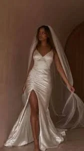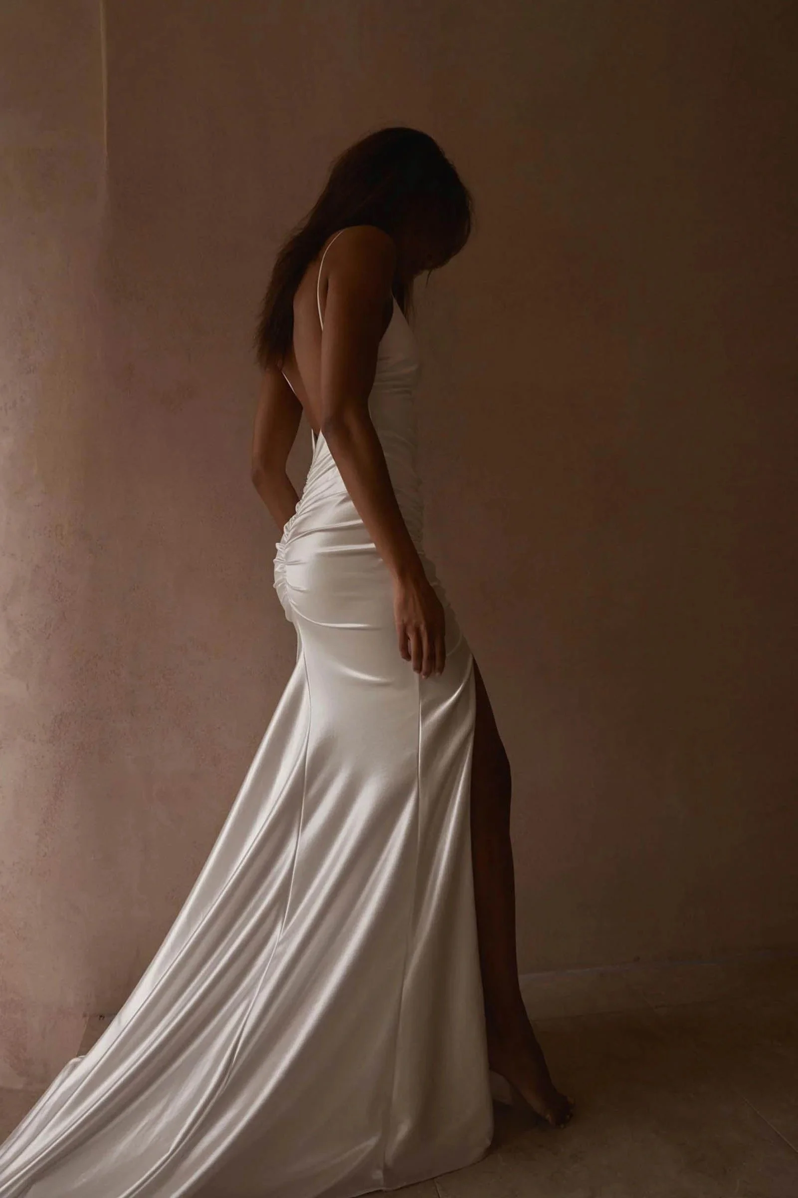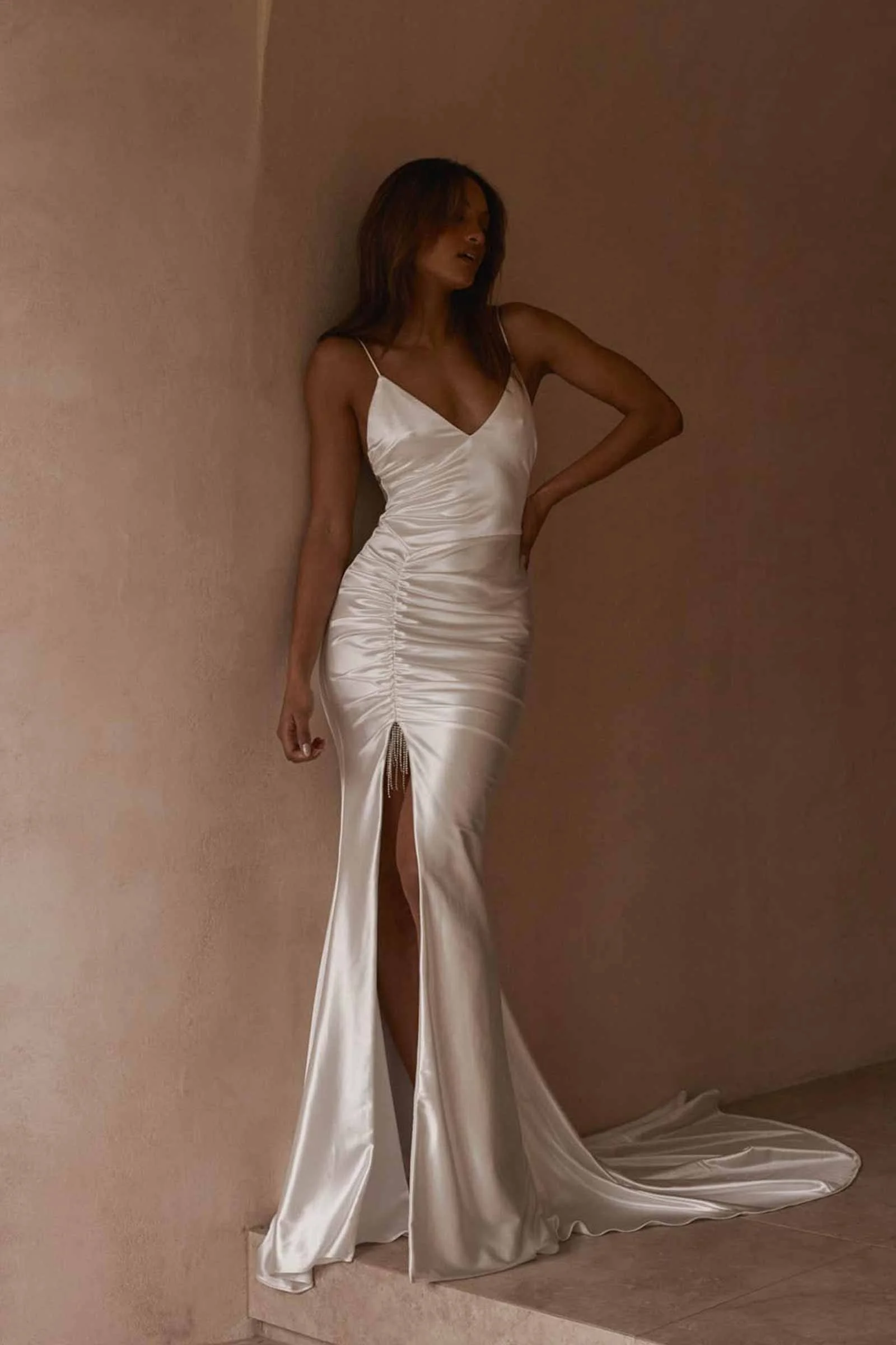 Radiate the night with Zsa Zsa. Understated luminescent lycra fabric defines a dynamic approach to traditional bridal norms. Feminine touches present through detailed rouching, and a daring thigh-high split. This backless wedding dress evokes glamorous seduction.