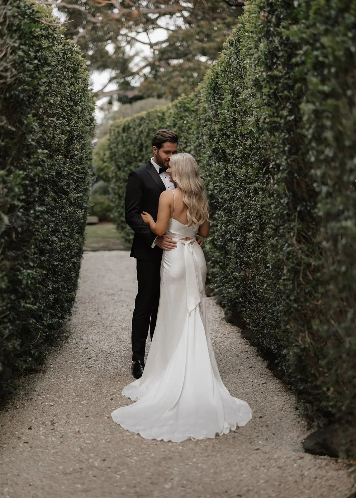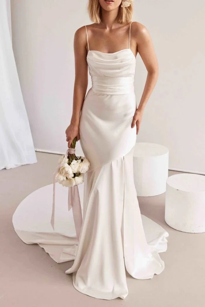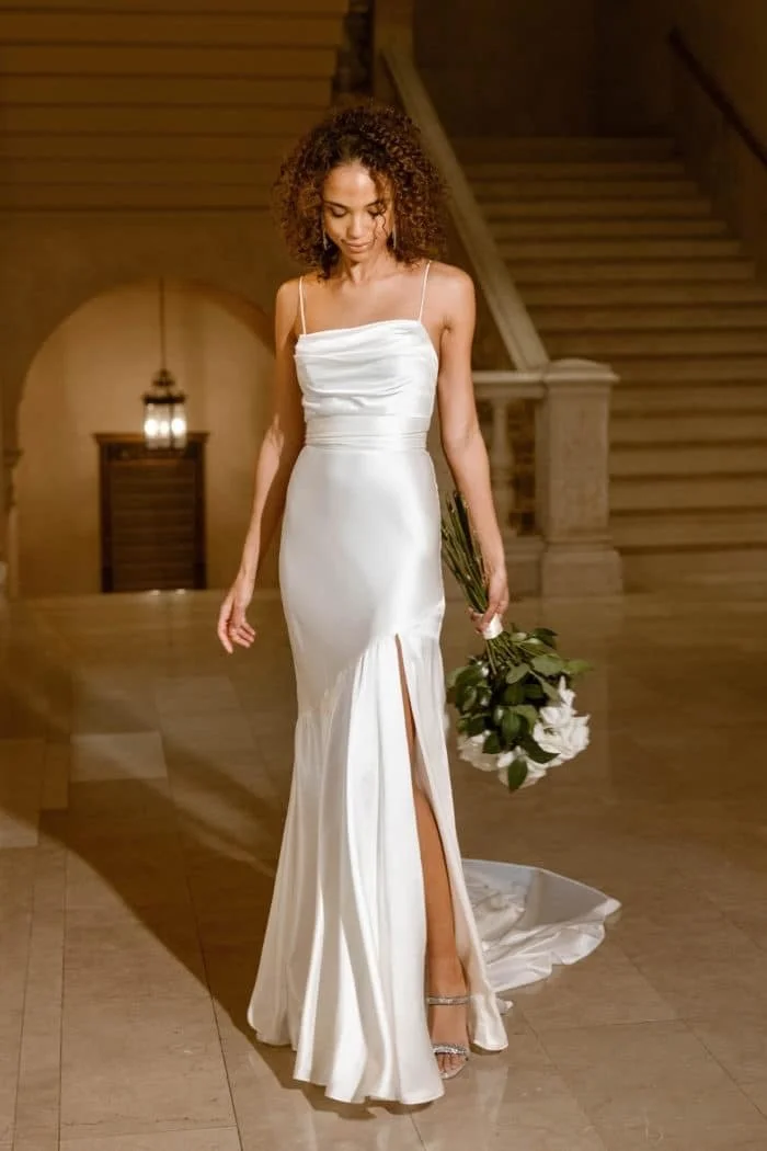 Valentina mirrors the softness of femininity. This ivory satin wedding dress boasts a liquid-like sleekness, while a diverse back tie poses individuality with a smooth finish and effortless drape.