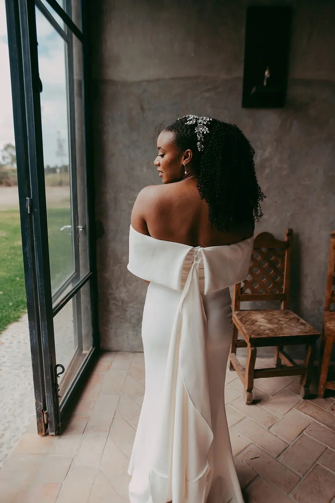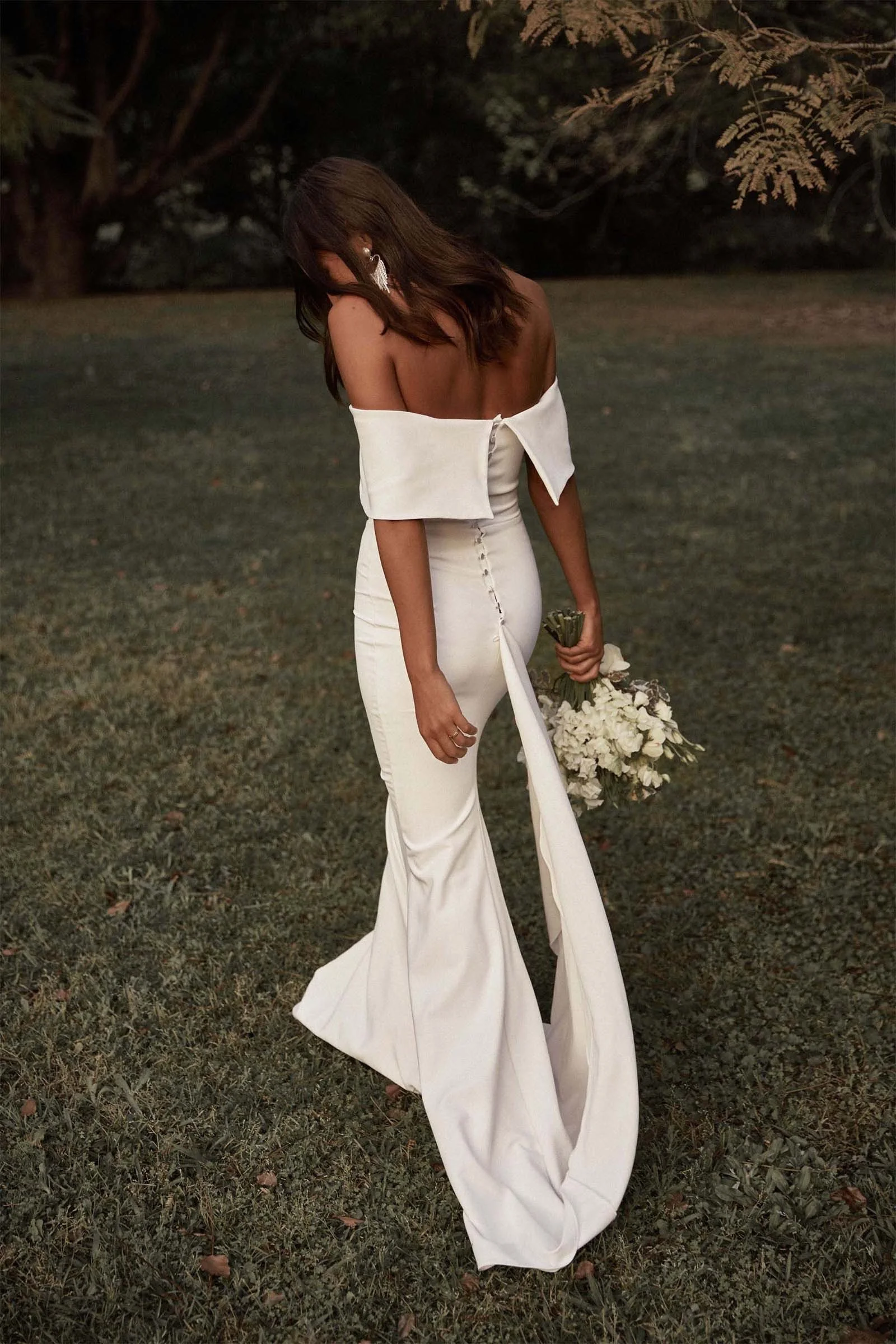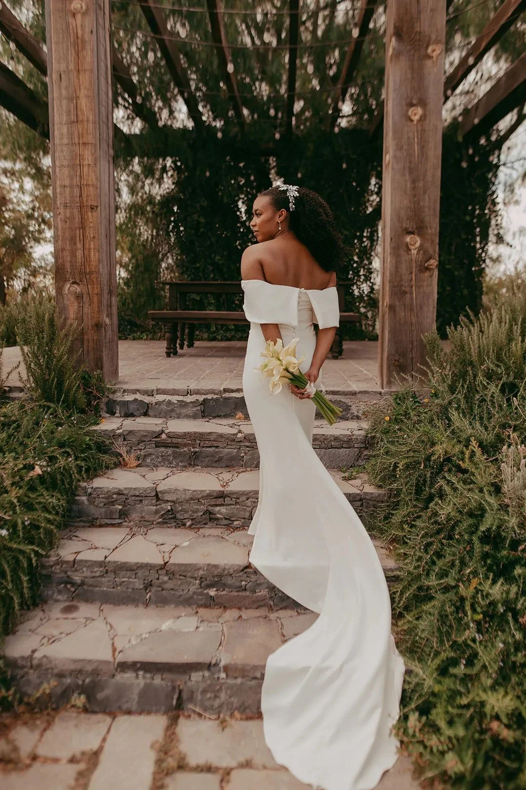 Mila, a classic for the modern era. Ethically handcrafted from buttery stretch crepe that reveals the silhouette, this elegant off-the-shoulder wedding dress evokes beauty and transitional sophistication.