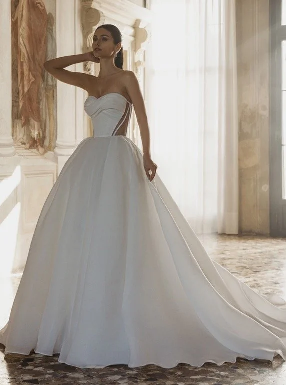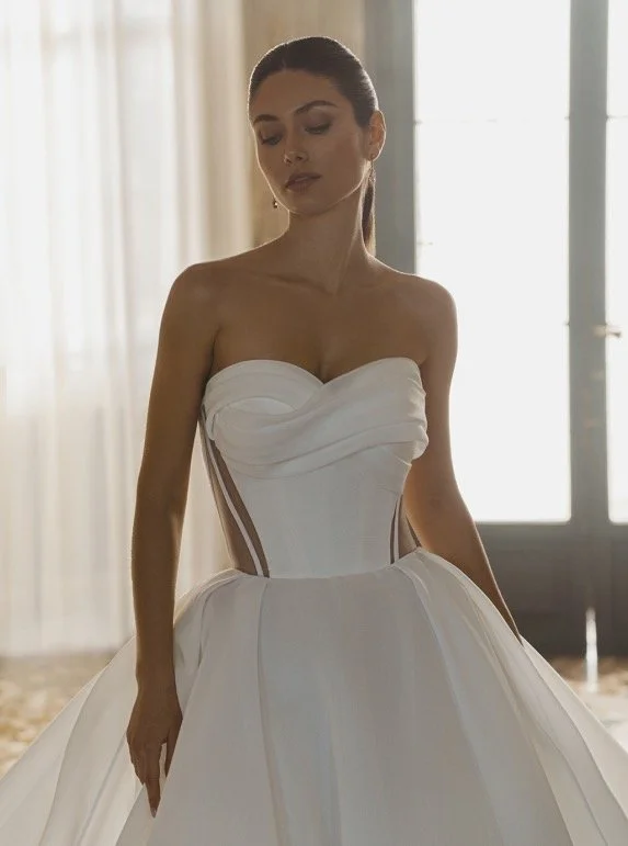 The CHANDRA gown is simply breathtaking. Its textured, strapless sweetheart neckline exudes romance and femininity, flattering the bride's décolletage with timeless charm. The mesh back adds a touch of modern sophistication, while buttons down the skirt offer a classic yet whimsical detail. With its seamless blend of traditional elements and contemporary design, CHANDRA is a stunning choice for the bride seeking an effortlessly luxurious look on the big day.
