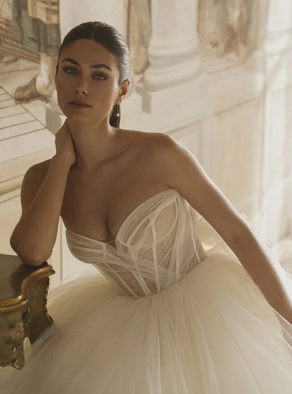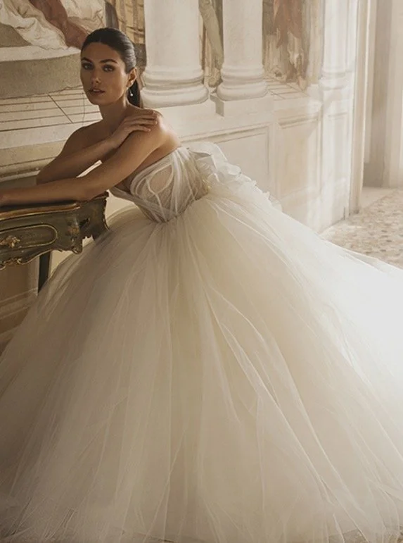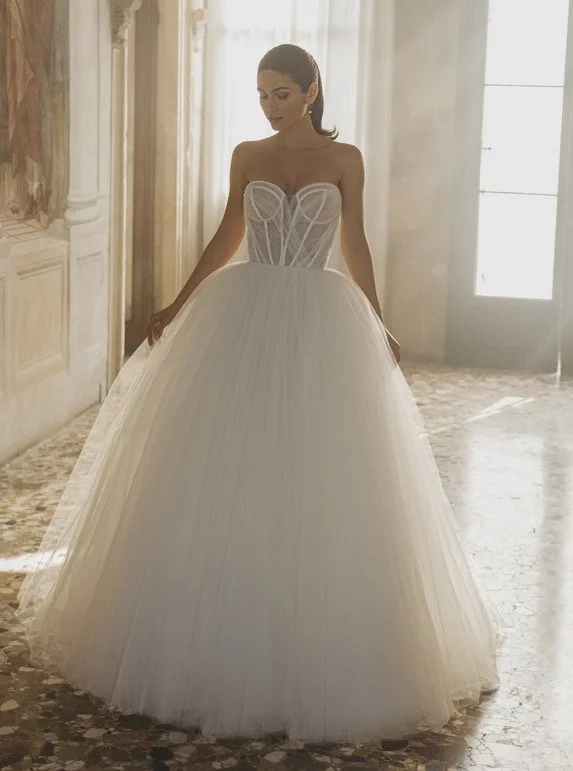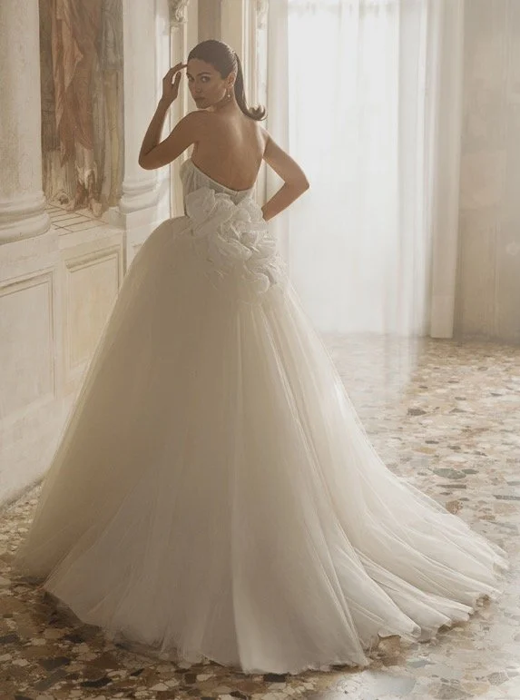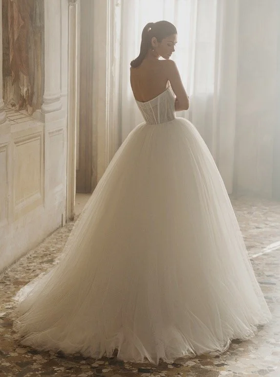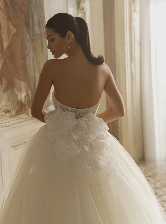 The strapless sweetheart neckline gracefully frames the décolletage, exuding timeless allure while offering a touch of modern sophistication. Adorned with a delicately ruched tulle bodice, this gown accentuates the bride's figure with a subtle yet captivating texture, ensuring a flattering fit that enhances her natural beauty. Adding a whimsical touch, a detachable 3D flower corsage embellishes the back, creating a stunning focal point that captures the essence of femininity. With its voluminous tulle skirt cascading into layers, this gown is a true masterpiece, destined to make every bride feel like a fairytale princess on her special day.