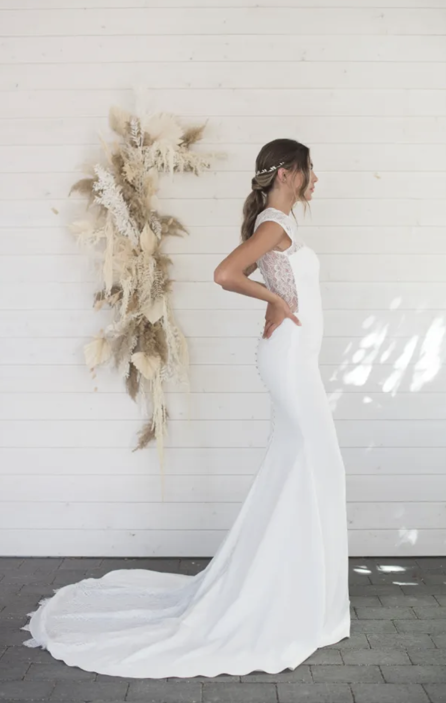 A very feminine design, this classic cap-sleeved lace gown is a showstopper. A sheath crepe gown with a modified scoop neckline topped with a delicate and soft chantilly lace that softly covers the neck and back, allowing the skin to be showcased under the stunning lace. The stunning train features a godet panel that gives the spectacular train extra movement. The back of the gown is adorned with buttons from the top of the neck.