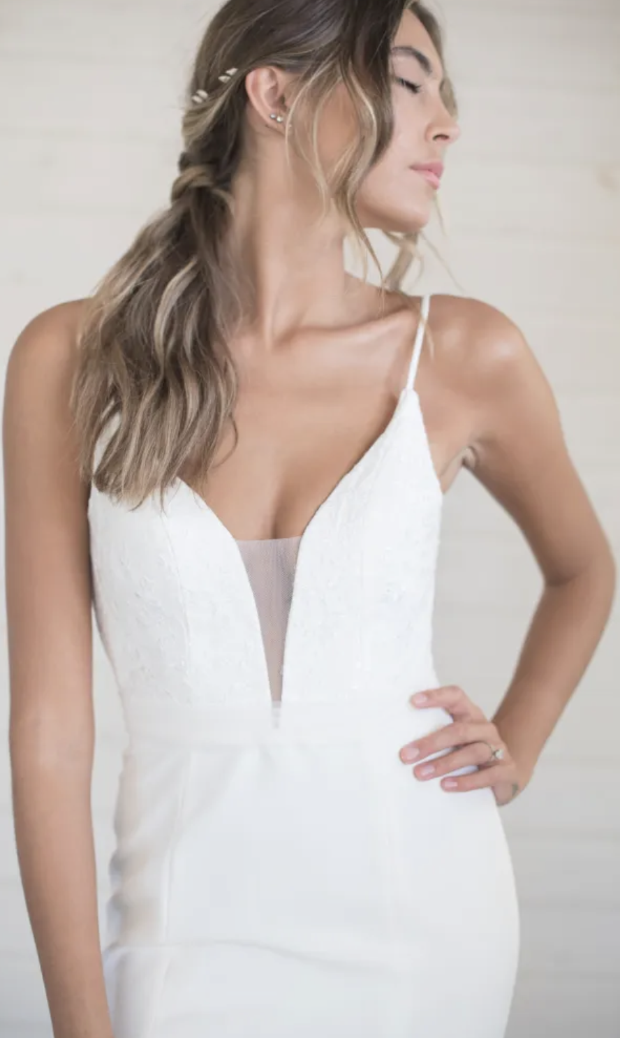 Eva is a breathtaking wedding dress made for the modern bride. a lace covered plunging sweetheart neckline with illusion tulle creates a super flattering tailored bodice to pair with a sheath silhouette. The form fitted body leads to a sexy slit. The back is where you will find the simple charming bow detail of the tulle or chiffon belt that criss-crosses in the back adding a touch of chic charm to this stunning gown.