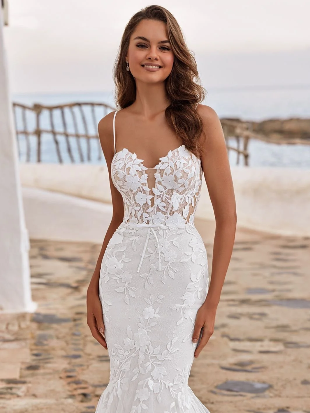 The DION gown is an absolute stunner. With intricate floral embroidered lace and sweet Chantilly lace detailing gracefully wrapping around the bodice and extending into a dramatic tulle mermaid skirt, this gown embodies timeless elegance and feminine allure. A plunging, illusion sweetheart neckline and delicate bow detail at the waist further enhance and flatter the figure.