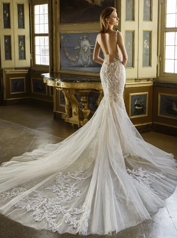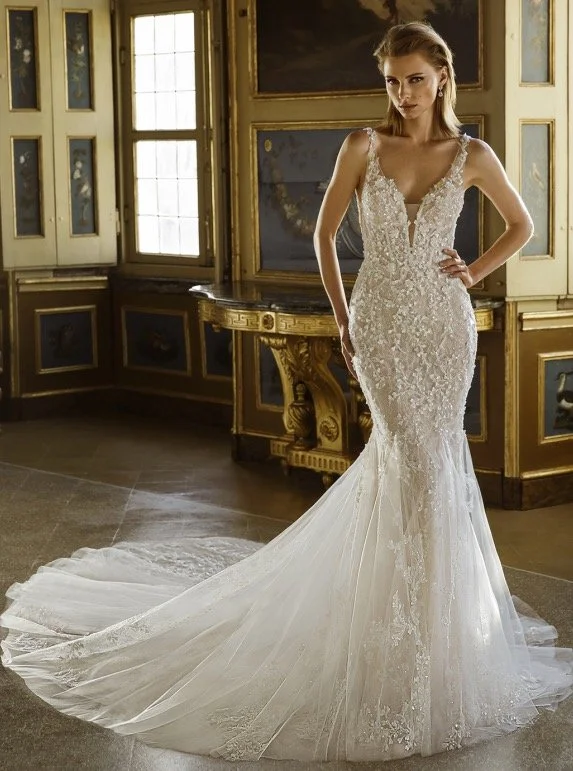 The BOBBIE gown is the epitome of a captivating mermaid style wedding dress. BOBBIE’s skirt is comprised of sparkling glitter tulle and a semi-sheer chiffon lining, while its 3D beaded floral lace and delicate 3D floral crepe petals descend into the light-as-air train. BOBBIE’s tailored bodice is made even more current with its sexy plunging V-neckline and illusion corset back.