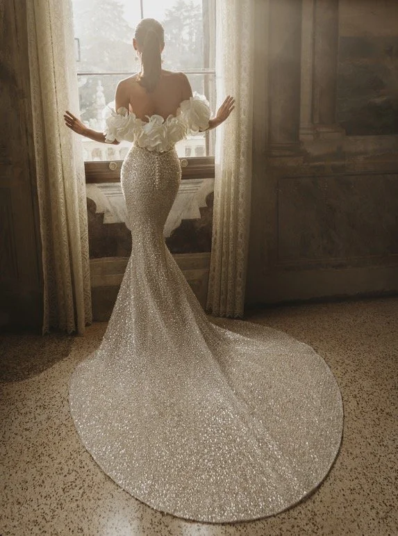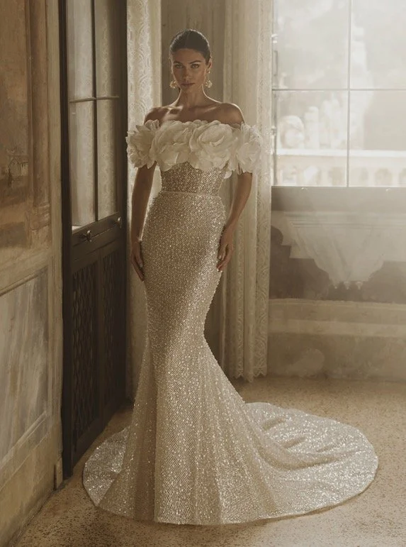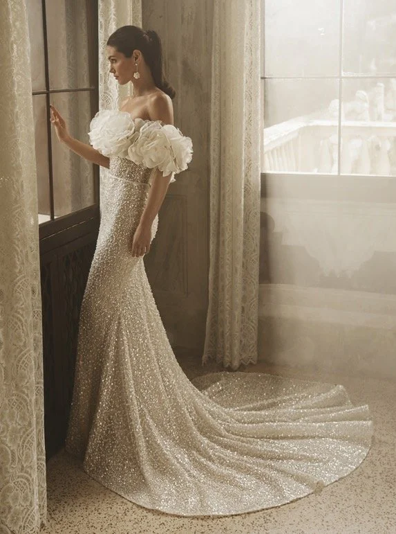 Embrace opulent glamour in the breathtaking CRYSTAL gown, featuring luxurious beaded fabric that glimmers with sophistication and style. The glitter tulle overlay adds radiant sparkle, while a tulle and chiffon lining ensures a comfortable, flattering silhouette. Draped elegantly off the shoulder is a mesmerizing 3D flower shawl, adding a romantic statement to this unforgettable bridal ensemble.