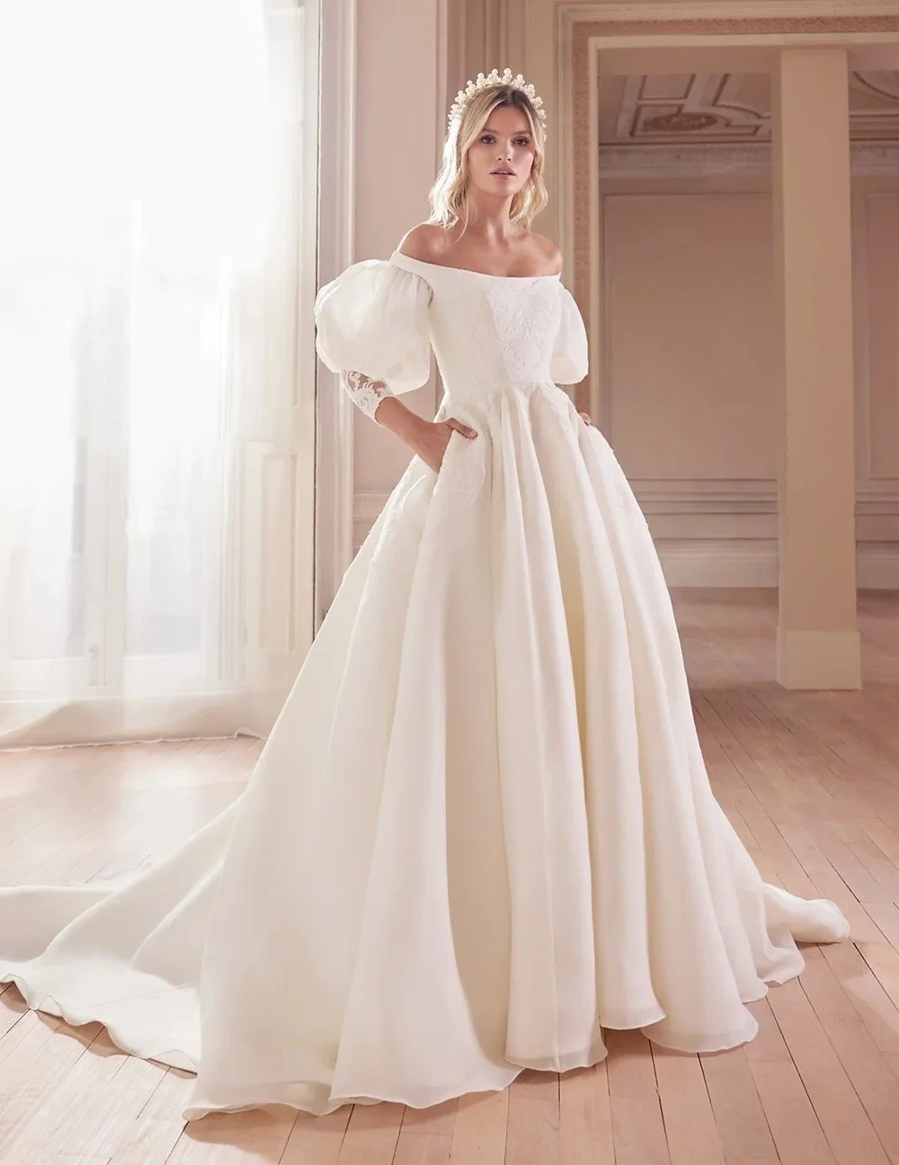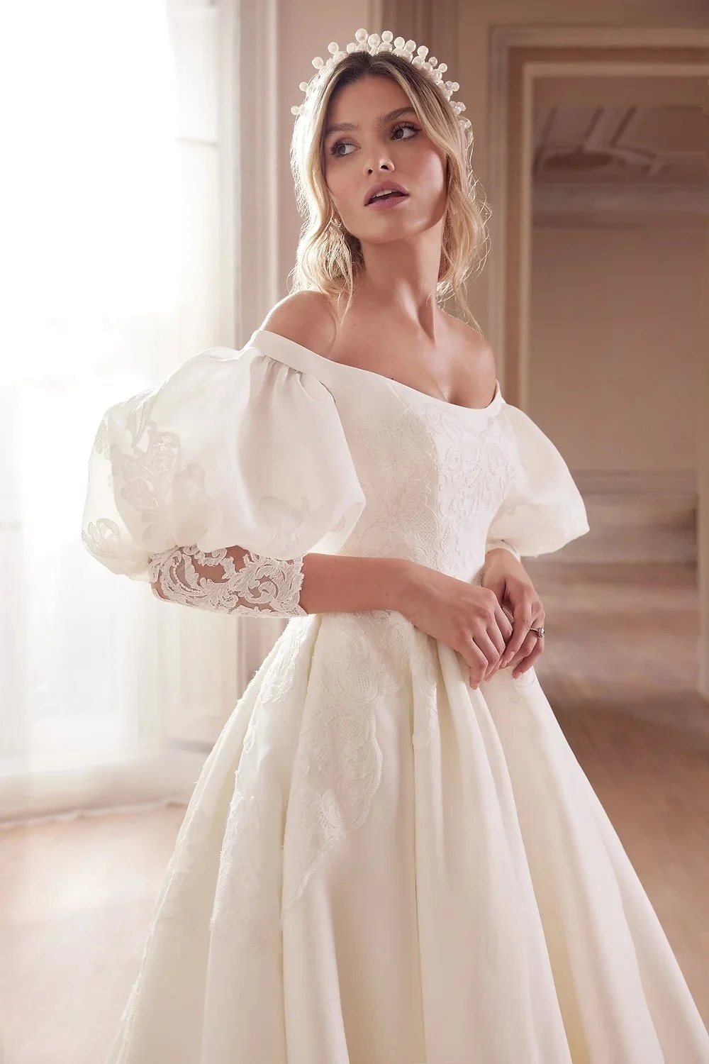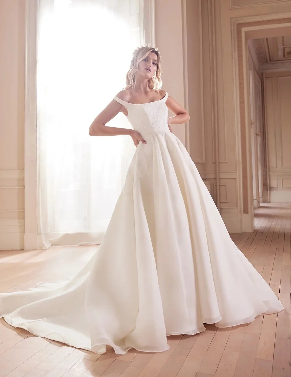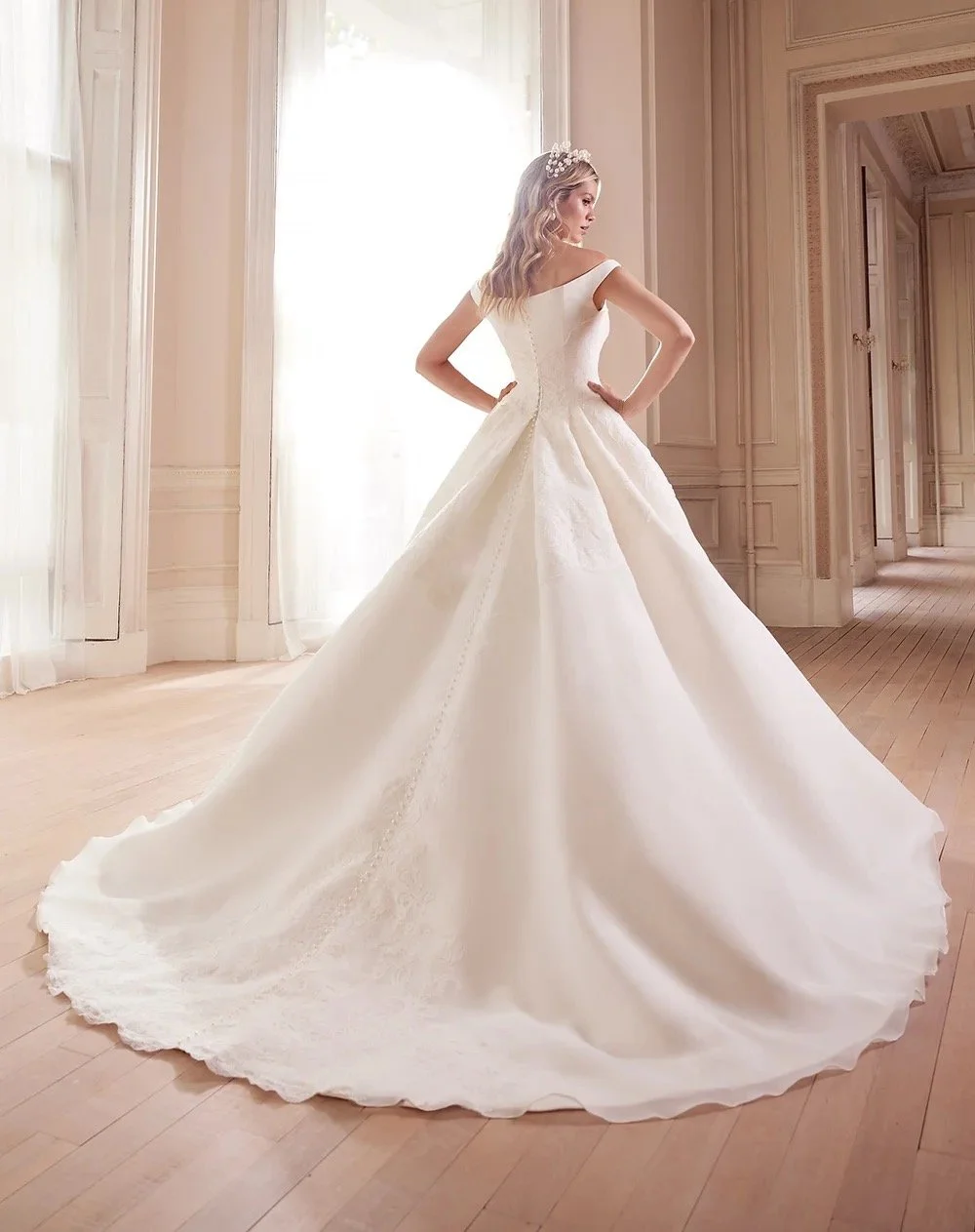 With its off-the-shoulder design and exquisite cotton embroidered lace, this gown is perfect for brides looking to make a statement on their special day. Anais is made from luxurious organdy and features a stunning silhouette that is enhanced by beautiful lace detailing. The gown is finished with pearl buttons running the length of the train, and comes with detachable sleeves with lace cuffs. Whether you're planning a cold weather or stately home wedding, Anais is the perfect choice for a truly romantic and unforgettable bridal look.