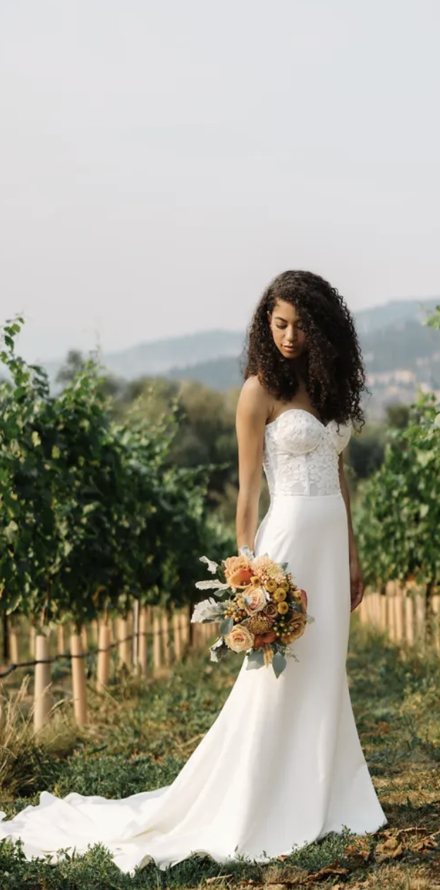 Embrace sheer enchantment with this sheath wedding dress. The lace corset top, adorned with the softest lace, accentuates your figure with a touch of romance. The simple, fitted crepe skirt compliments the soft lace with a touch of modern sophistication. Ayla is a testament to refined craftsmanship, ensuring you radiate elegance and confidence on your special day.