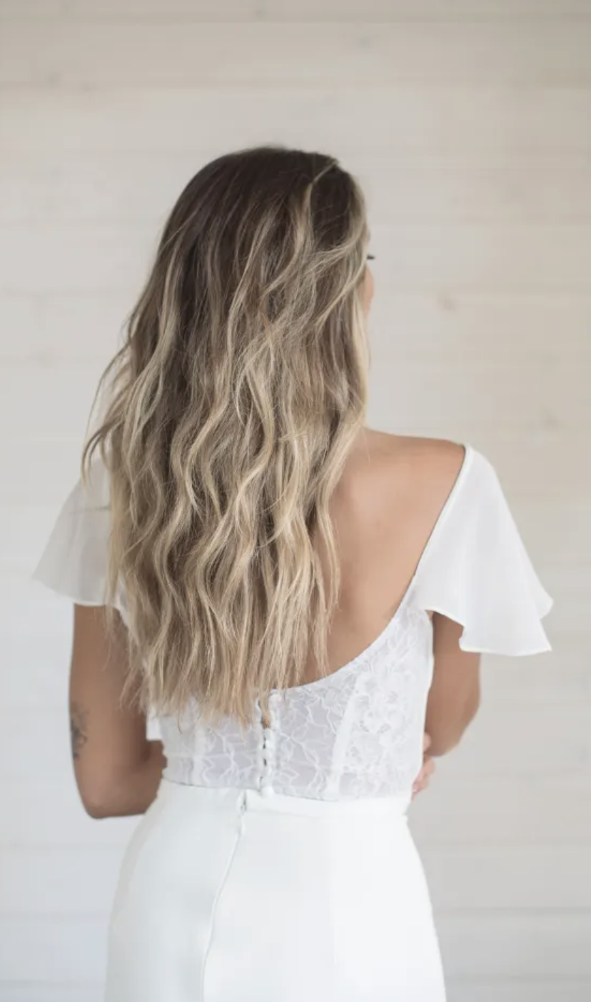 This exquisite handmade, ivory crepe Layla top is nothing short of detail. A modern scoop neckline and stunning shutter sleeves give this bridal top a touch of elegance, while the sheer lace back with buttons adds a touch of detail in a modern and romantic way. The Layla top can be ordered with or without sleeves.