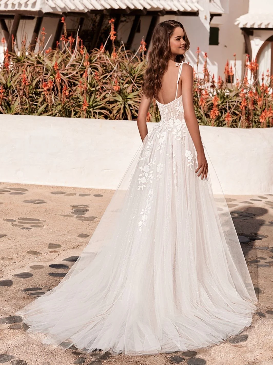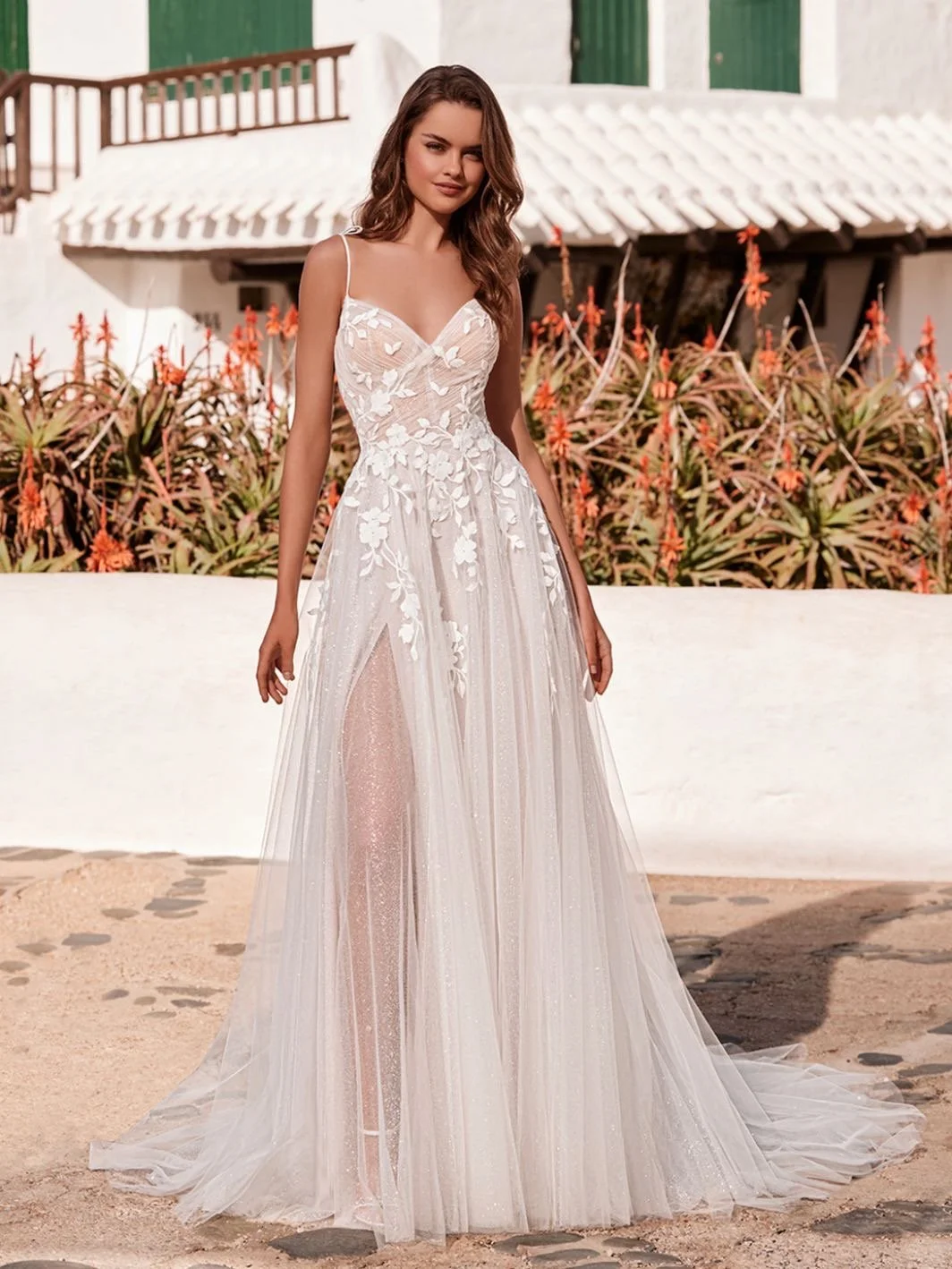 DOVE is an ethereal dream dress! This A-line wedding dress radiates with shining, shimmering splendor as layers of glitter tulle blend with sleek stretch georgette. The bodice is adorned with delicate pleated tulle and floral embroidered lace that cascades through the skirt. The peek-a-boo slit adds a sexy detail, while the shoulder bows on the delicate spaghetti straps give extra touches of sweet romance.