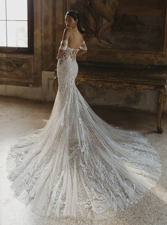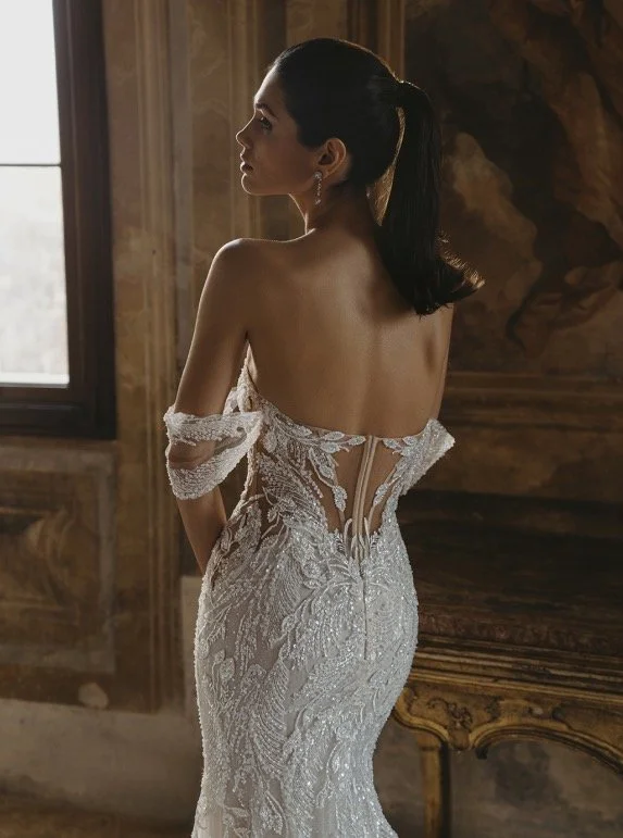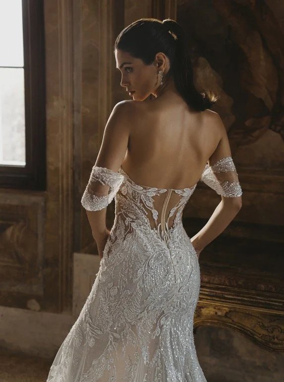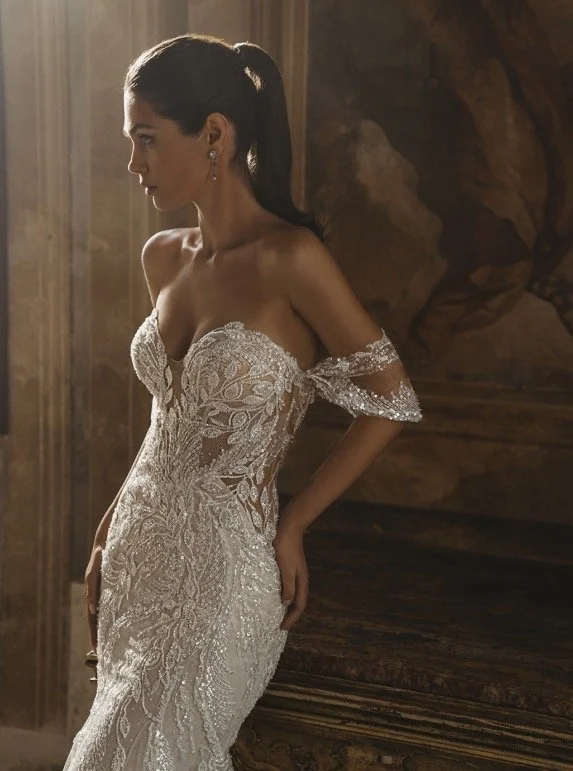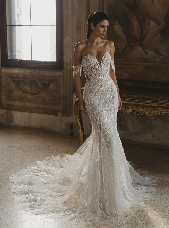 Embellished with beaded feathery lace and leafy lace motifs that dance along the bodice and trail down the elongated train, the COREENA gown exudes sophistication and charm, perfect for the bride seeking a blend of classic and modern elements. Its sexy sweetheart neckline and romantic, detachable off-the-shoulder straps make this gown unforgettable.
