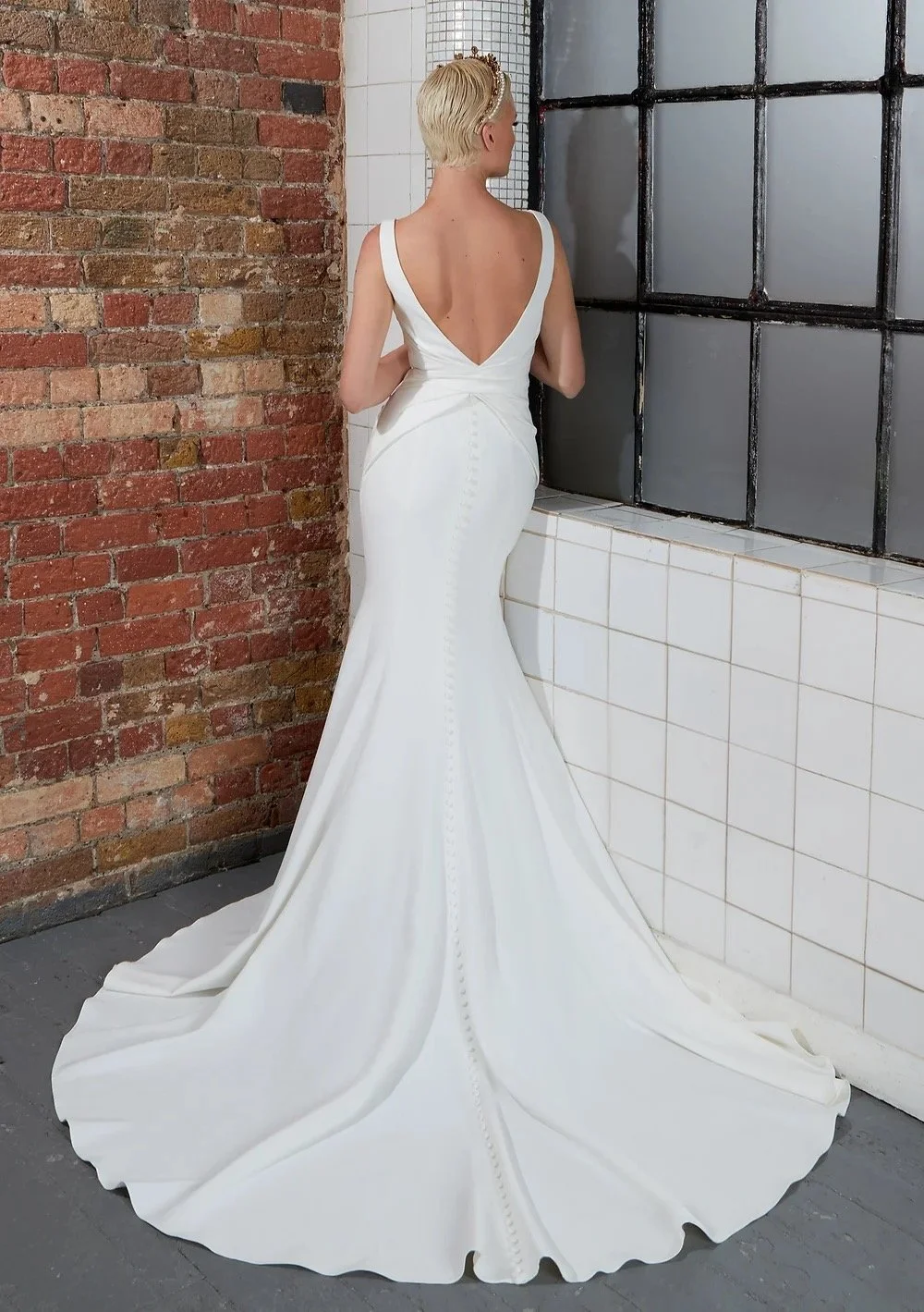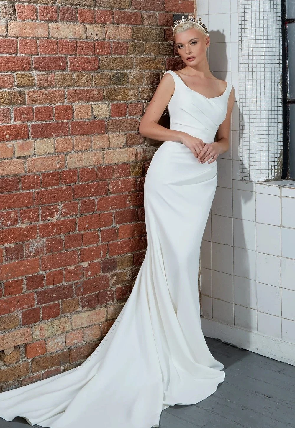 Introducing TESSA, the perfect choice for a bride looking for elegant simplicity. This soft fishtail silhouette flatters all body types in a wide V-neck gown crafted from luxurious crepe. The pleating detail along the bodice adds feminine charm, accentuating curves in all the right places. The covered buttons along the train complete the look with a touch of traditional elegance.
