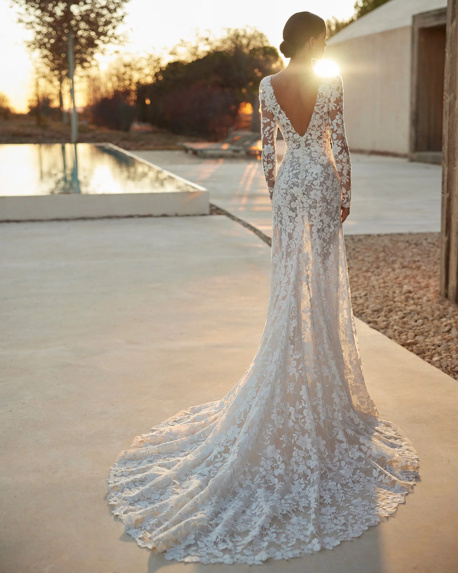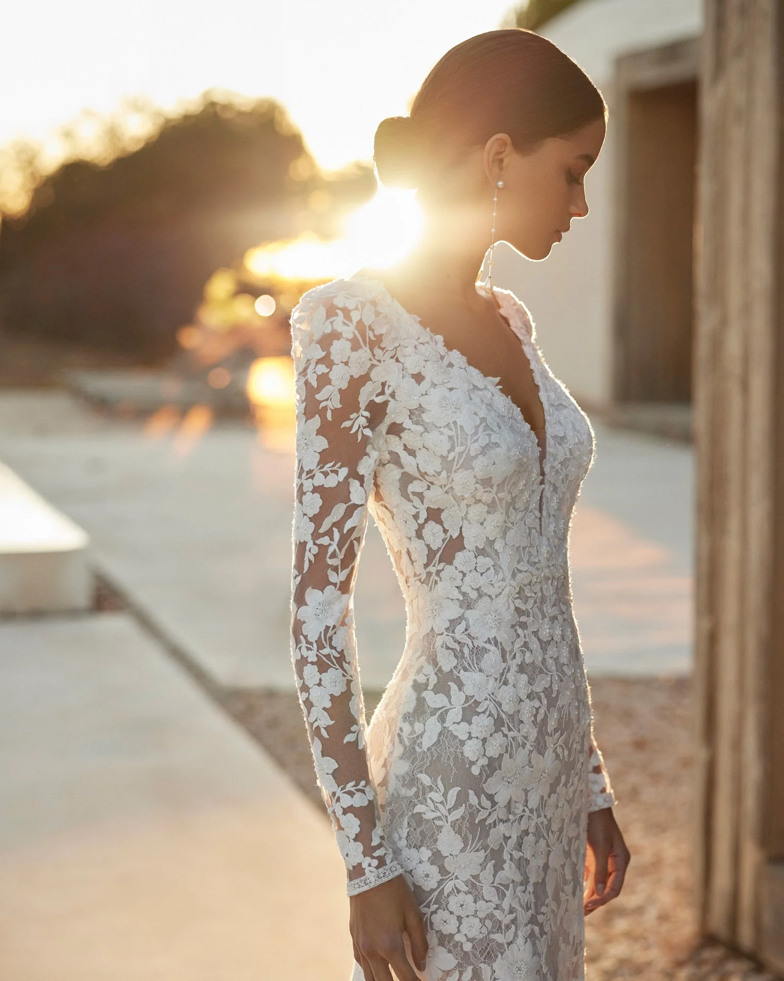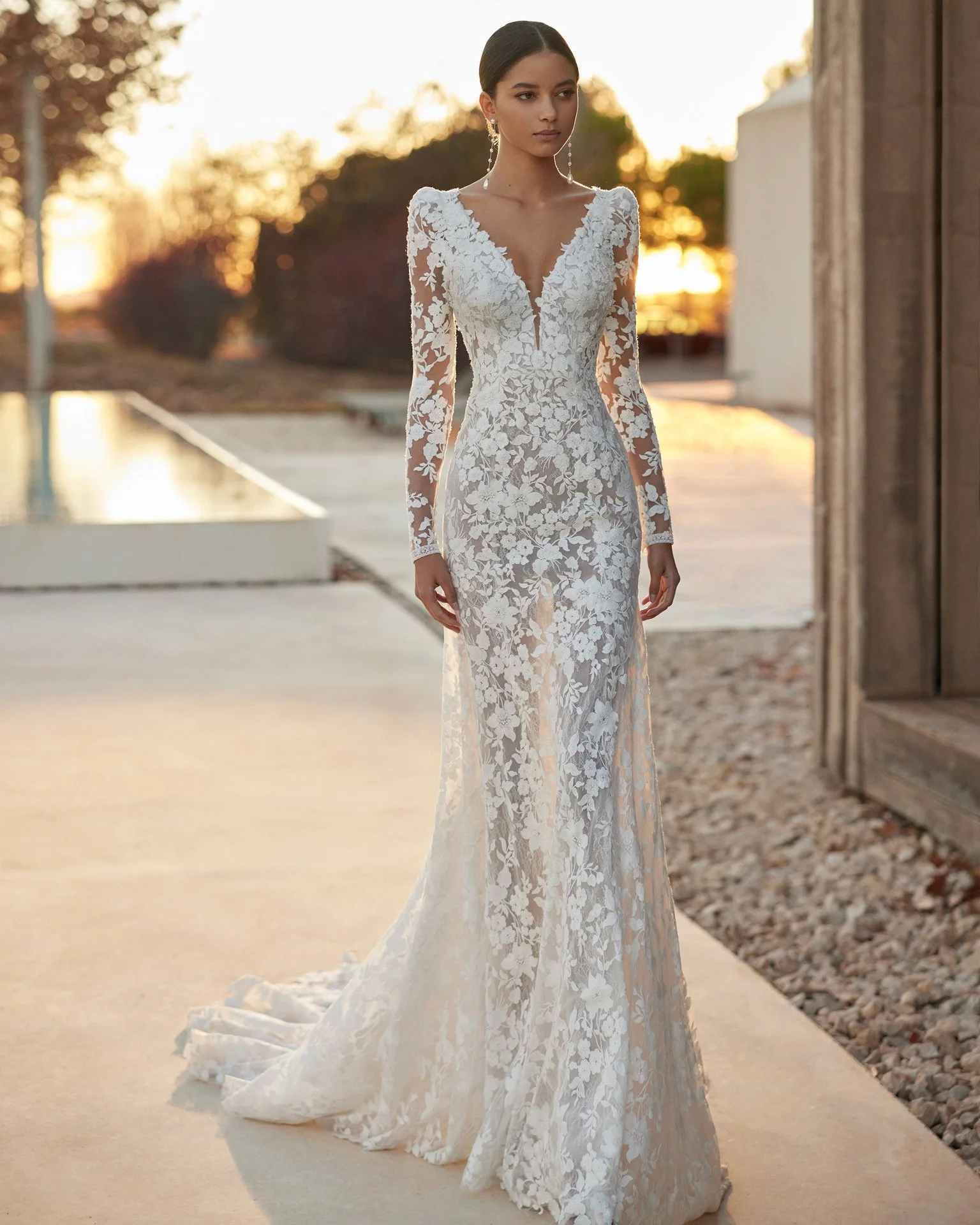 Sheath-style wedding dress in the Ibizan style, crafted in lace and beadwork. The plunging neckline, V-back and long sleeves complete the look.