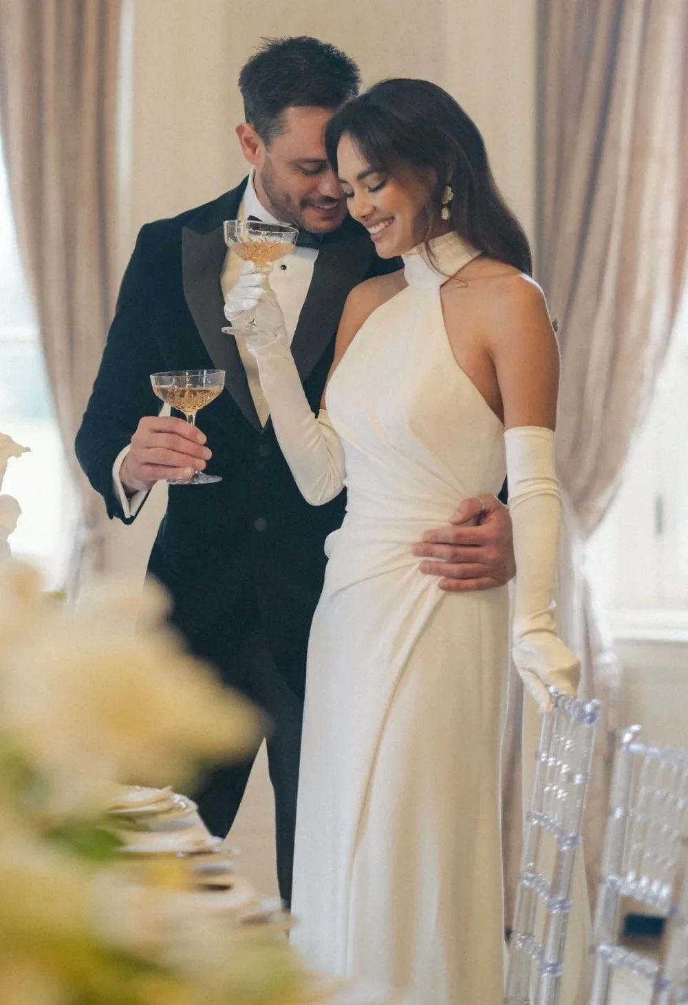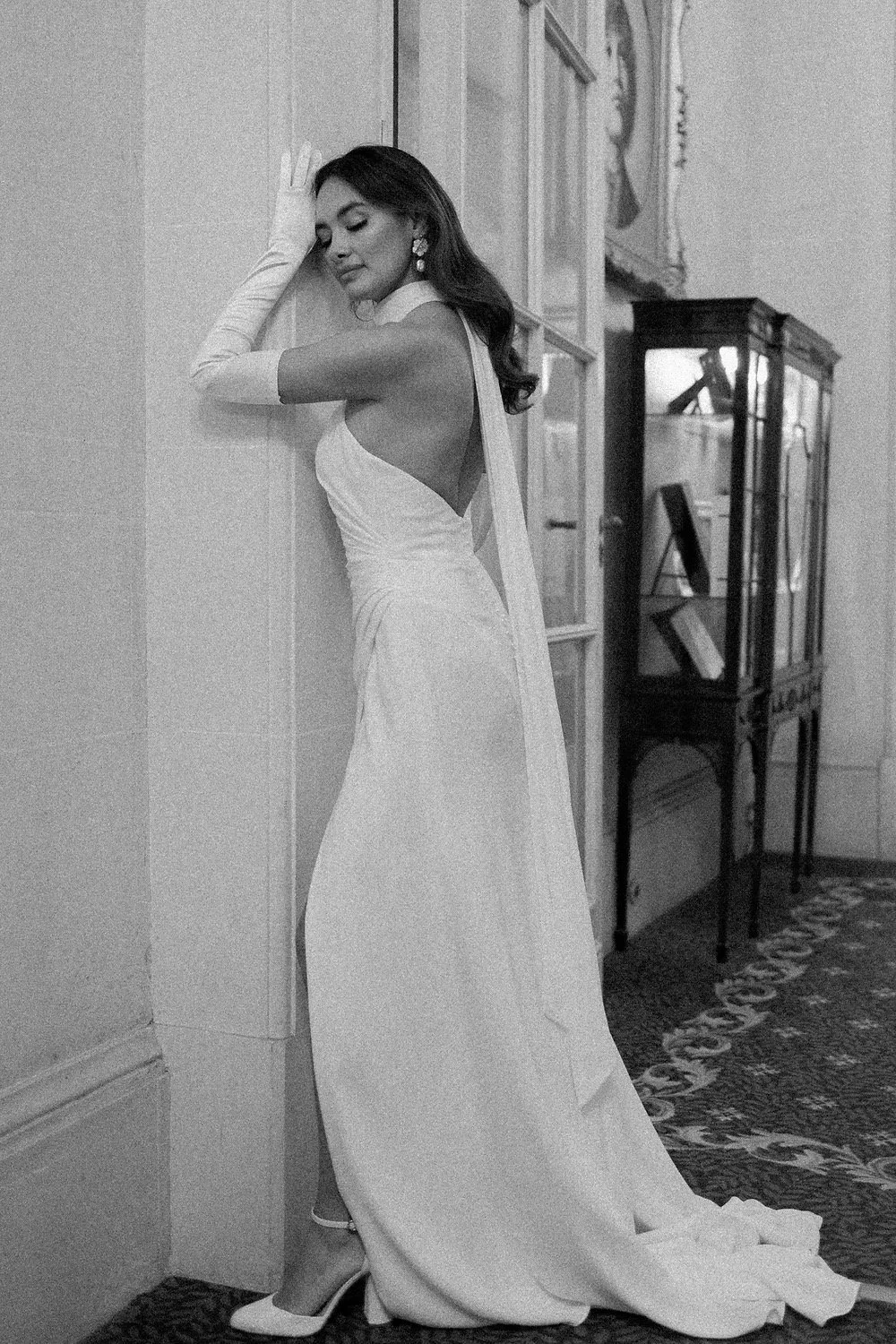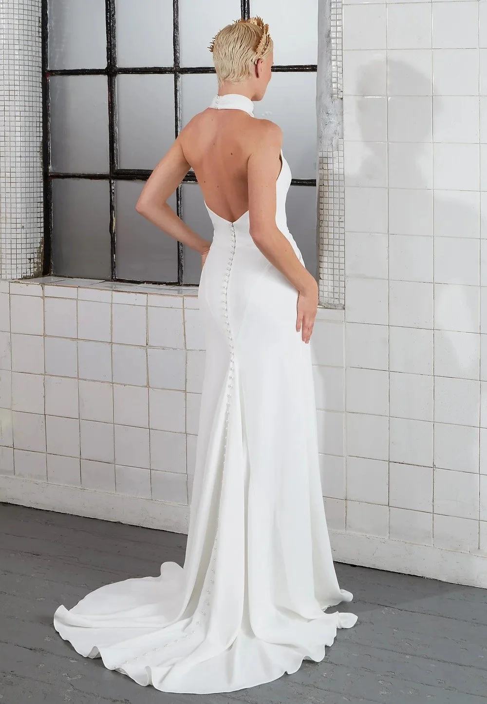 Introducing the stunning TIFFANY gown, the perfect choice for the modern bride seeking sophisticated elegance. This chic satin crepe dress features a flattering high neck and pleats, highlighting your curves in all the right places. The thigh high split and low cut back add a touch of sexiness to this timeless design. Available in both Ivory and black, this gown is suitable for both daytime and evening weddings.