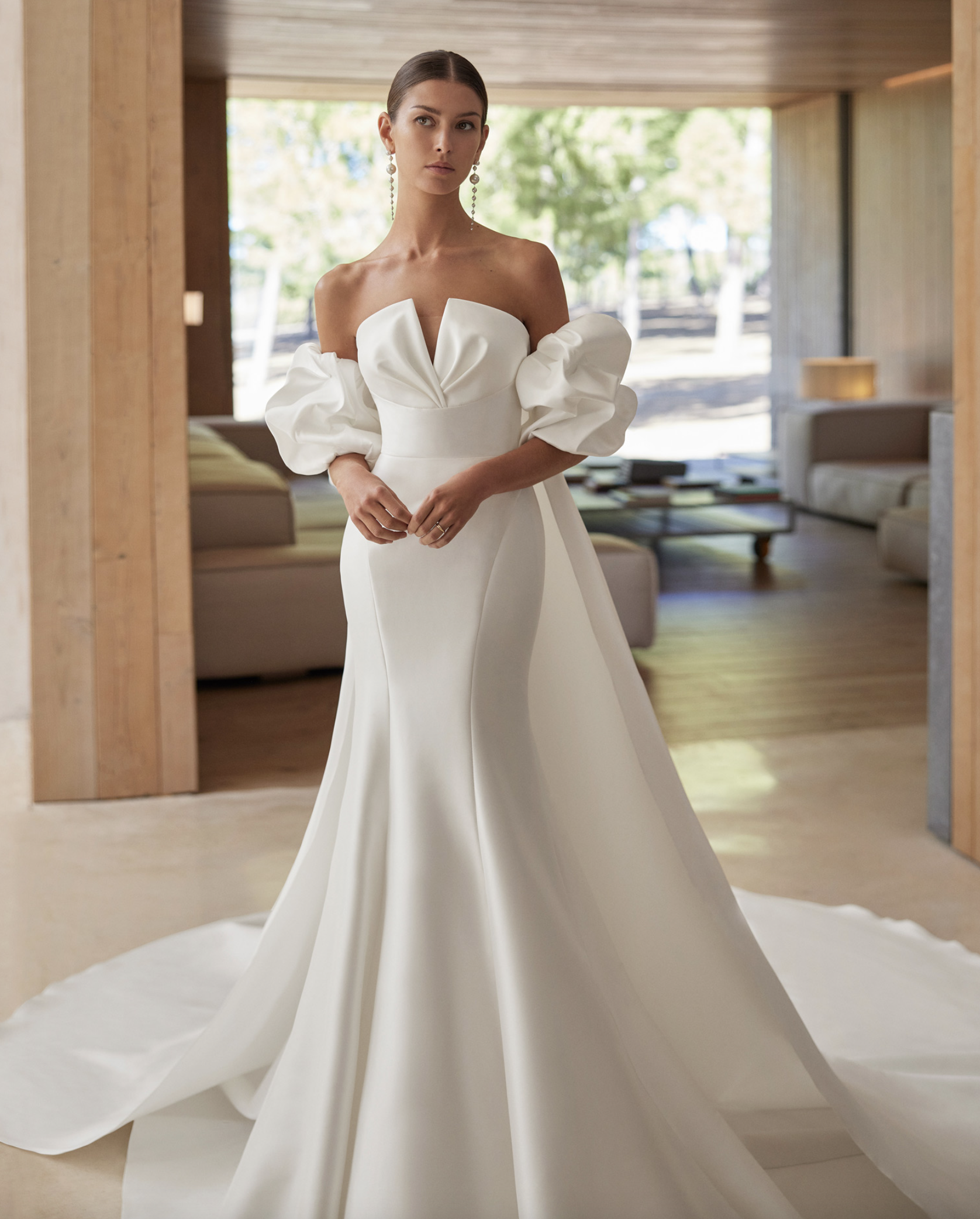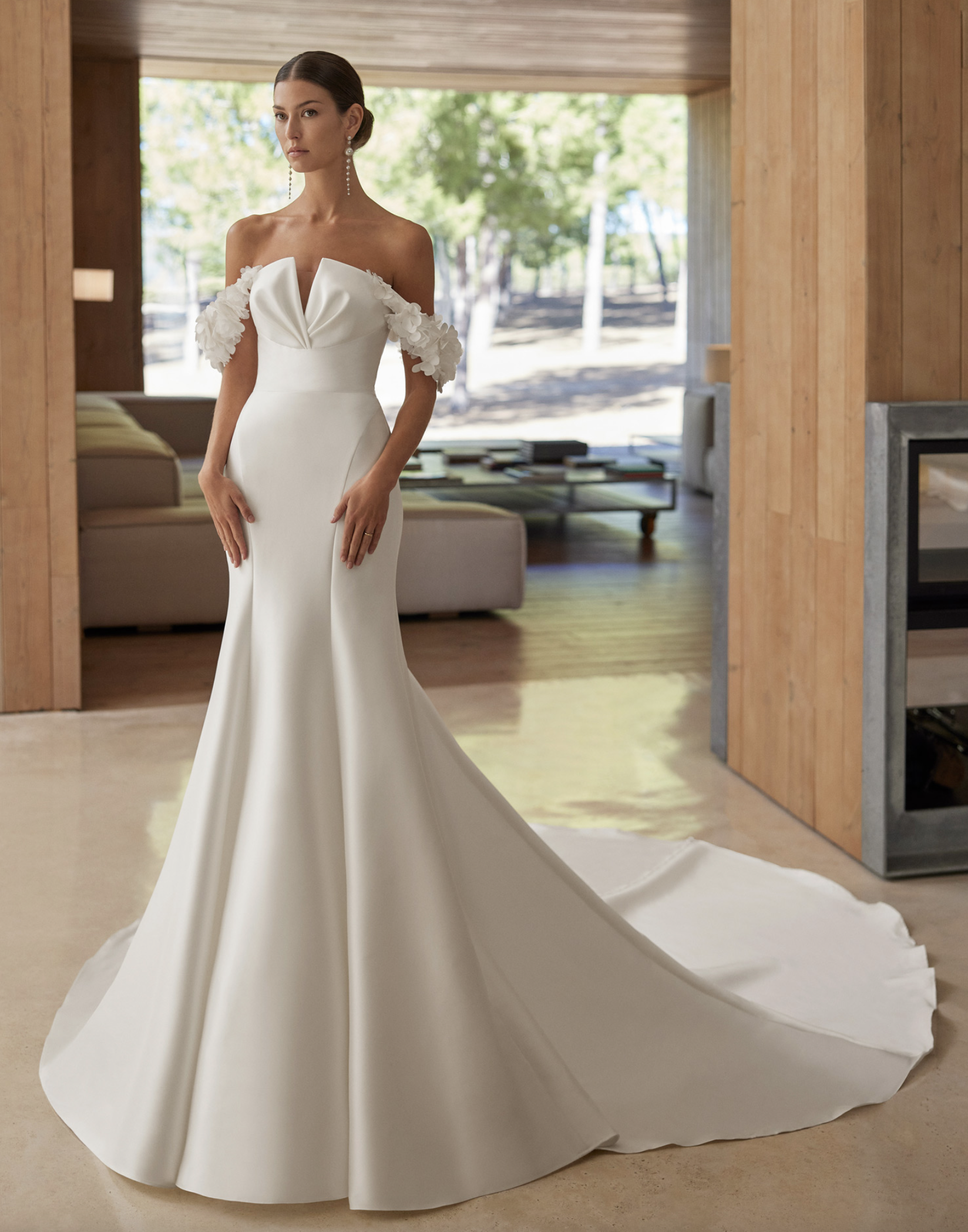 Beautiful fitted wedding gown, with detachable off-the-shoulder sleeves with 3D Florals. The balloon sleeves with cape are optional.