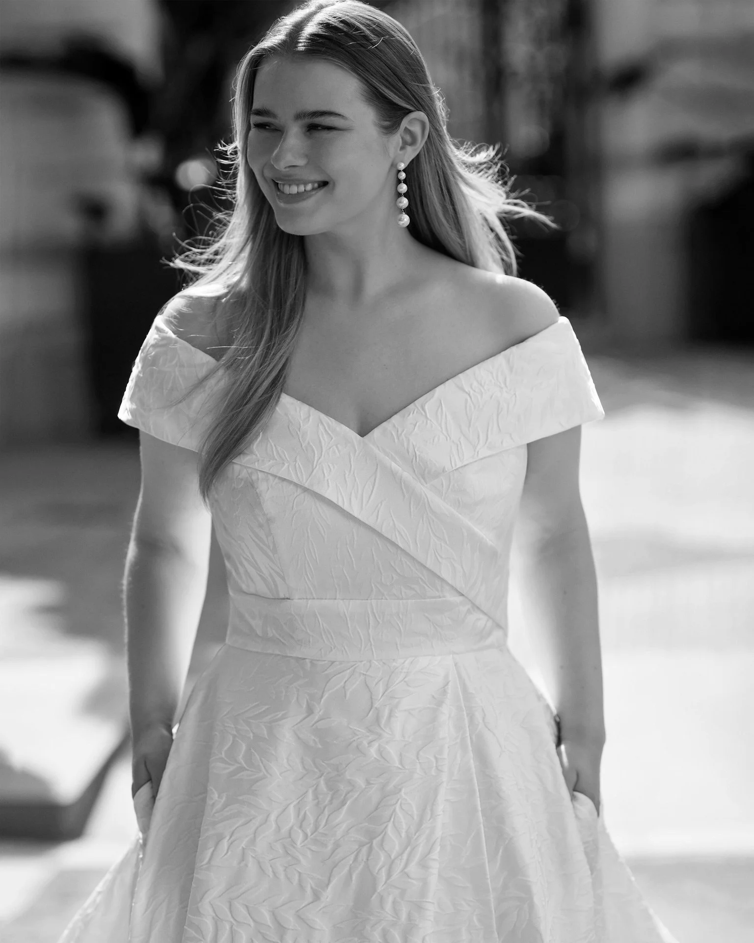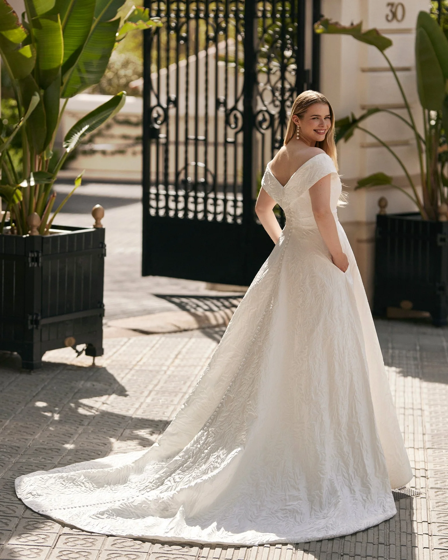 Classic long A-line wedding dress. Made in brocade, it features an off-shoulder neckline and buttoned back. The curved skirt with front slit and pockets completes the look.