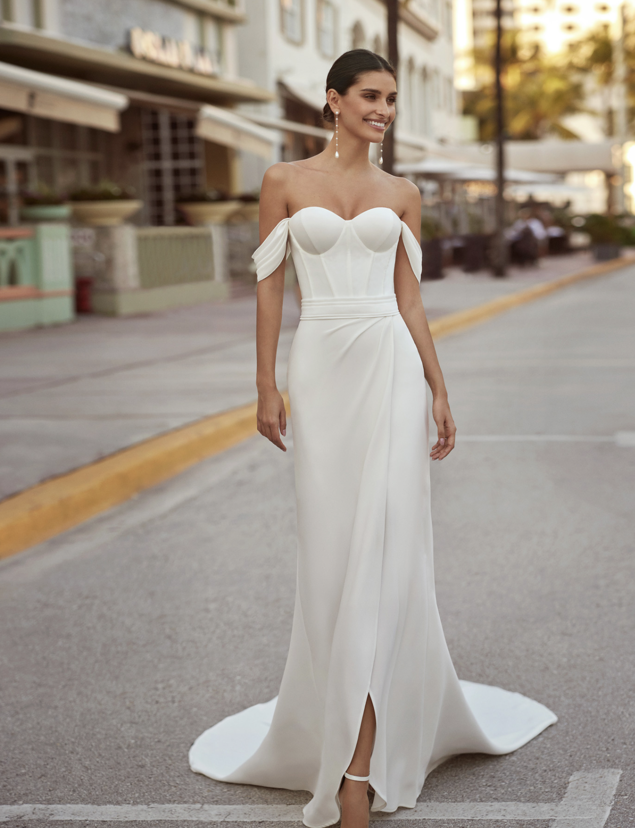 Elegant short wedding dress, made in crepe. It features a sweetheart neckline, corset back, detachable straps and overskirt with a side slit.