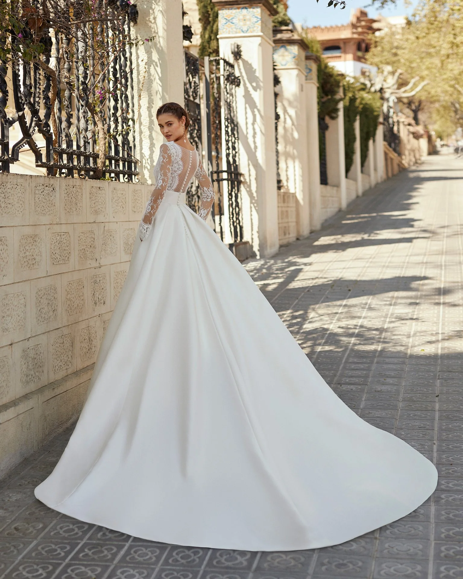 Classic tailored wedding dress in lace, beaded lace and Brescia brocade. V-neckline and illusion back and long sleeves with flounces. Skirt features pleats at the waist and has pockets.
