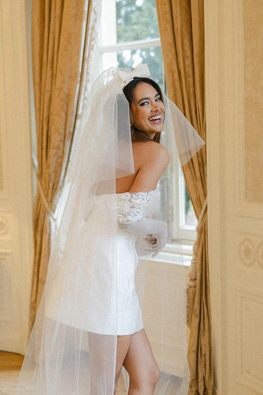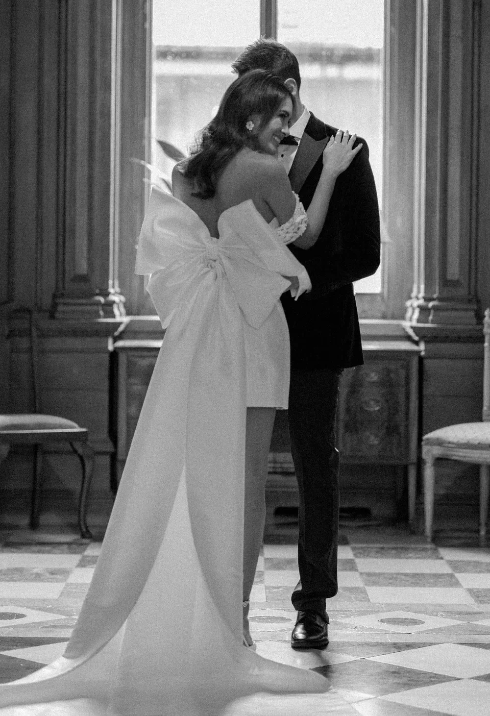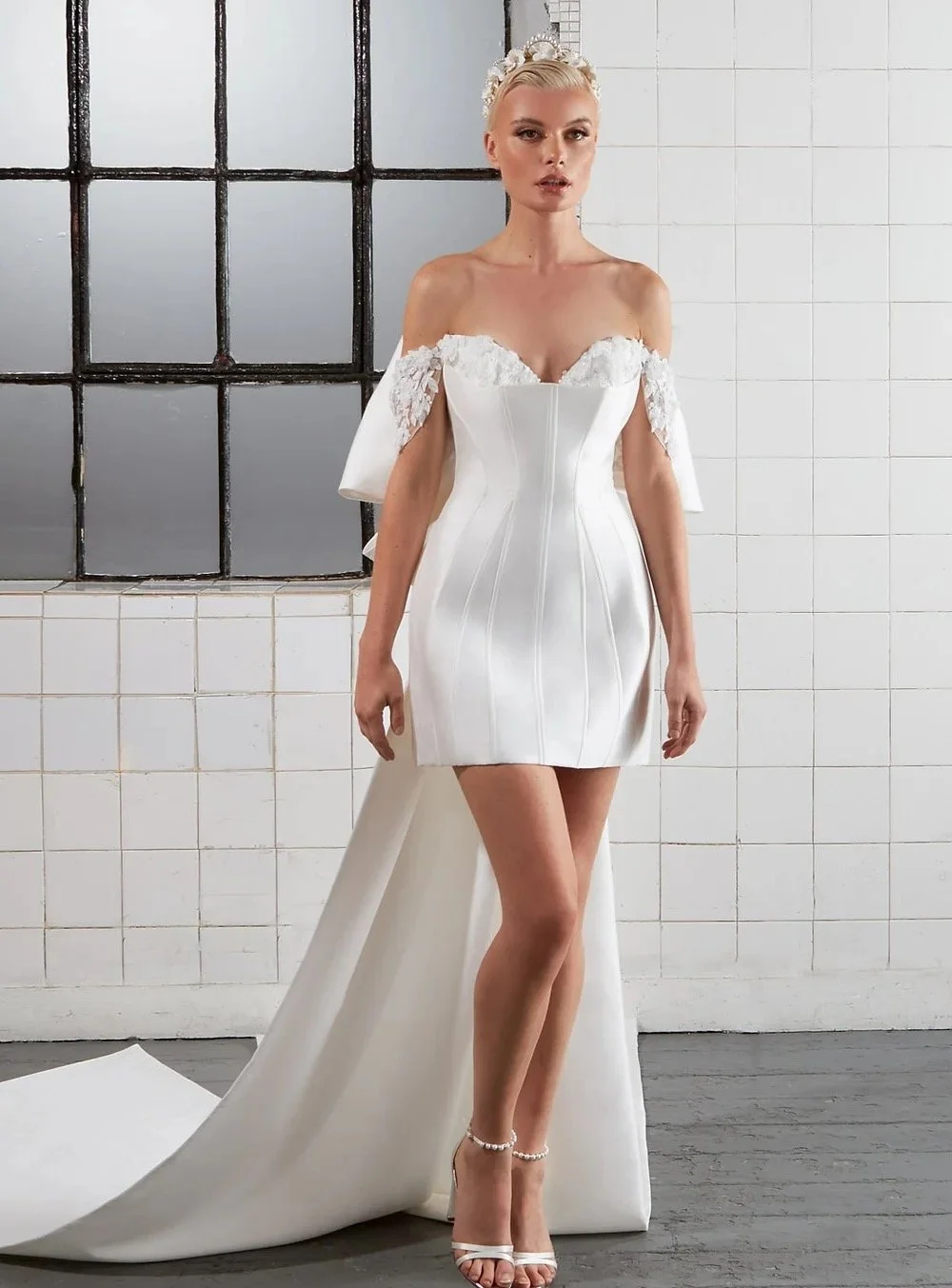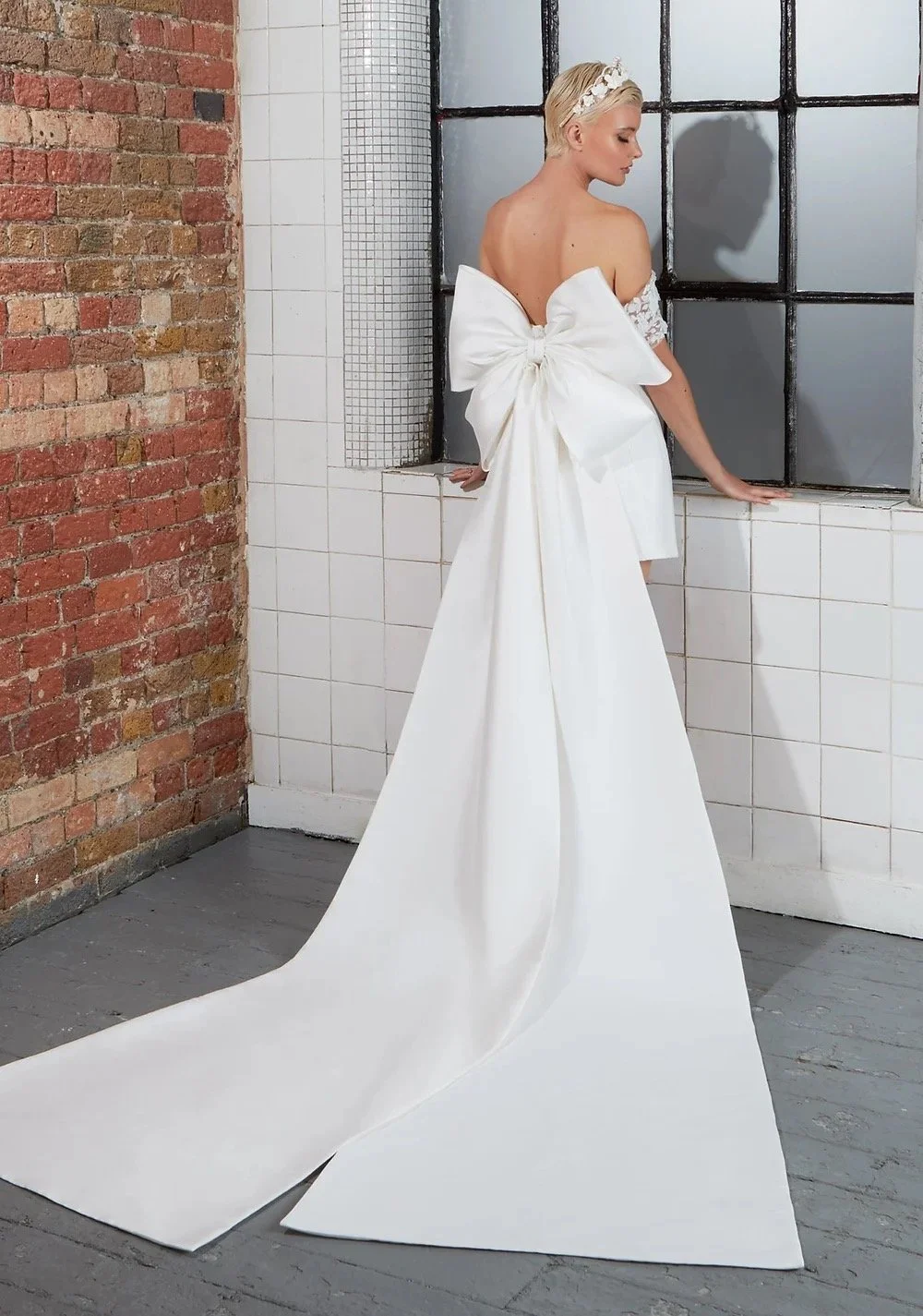 Looking for a statement wedding dress? Turn heads in MIMI. This short corseted gown features a detachable oversized bow for a dramatic touch. The gown is enhanced with beaded lace bust and straps for an added touch of elegance.