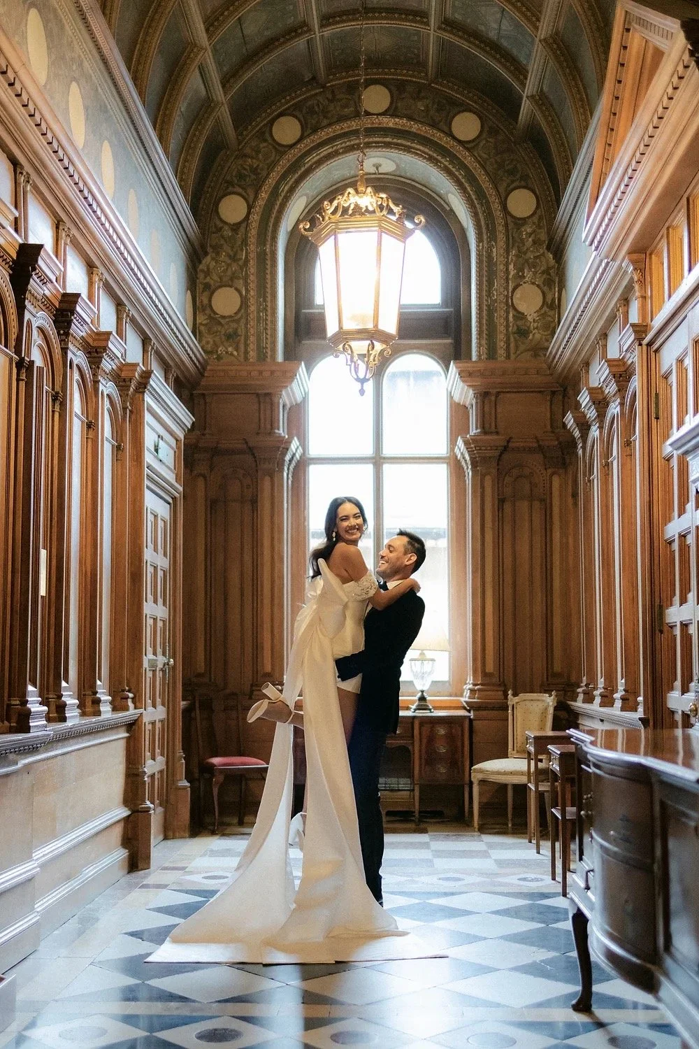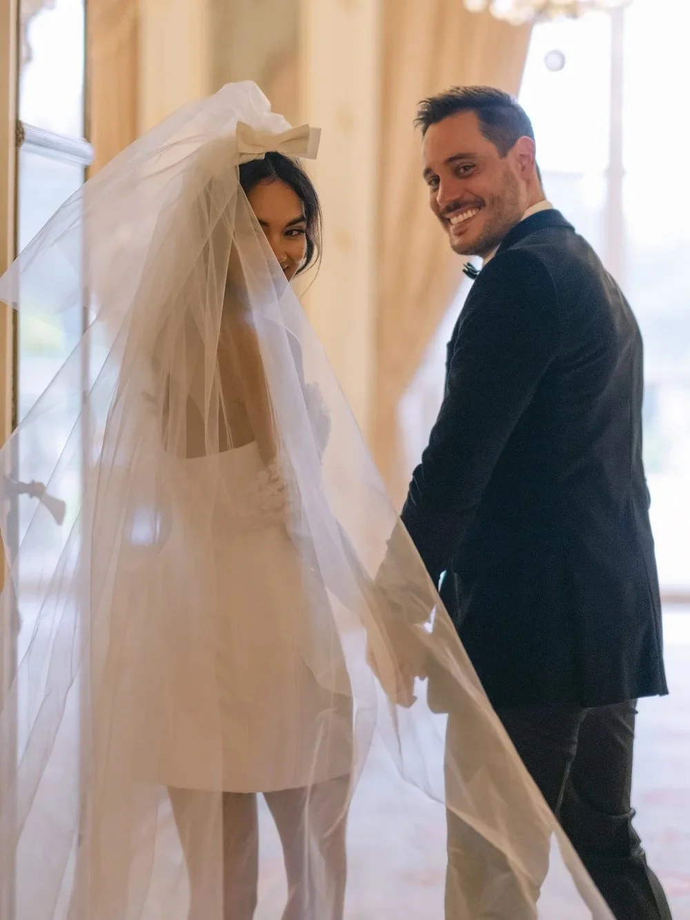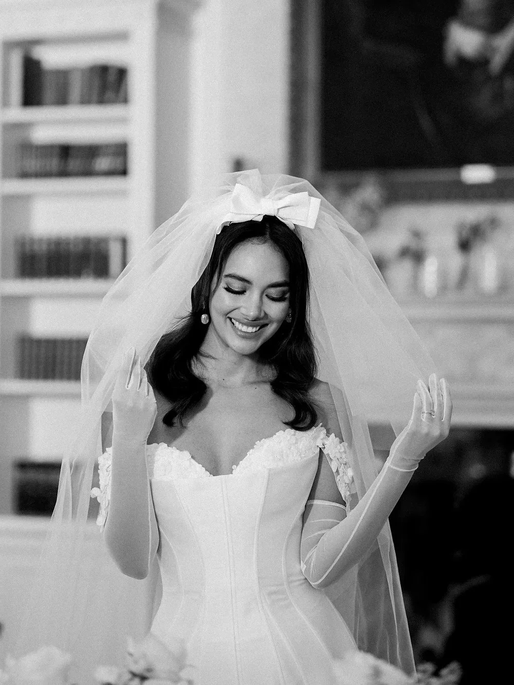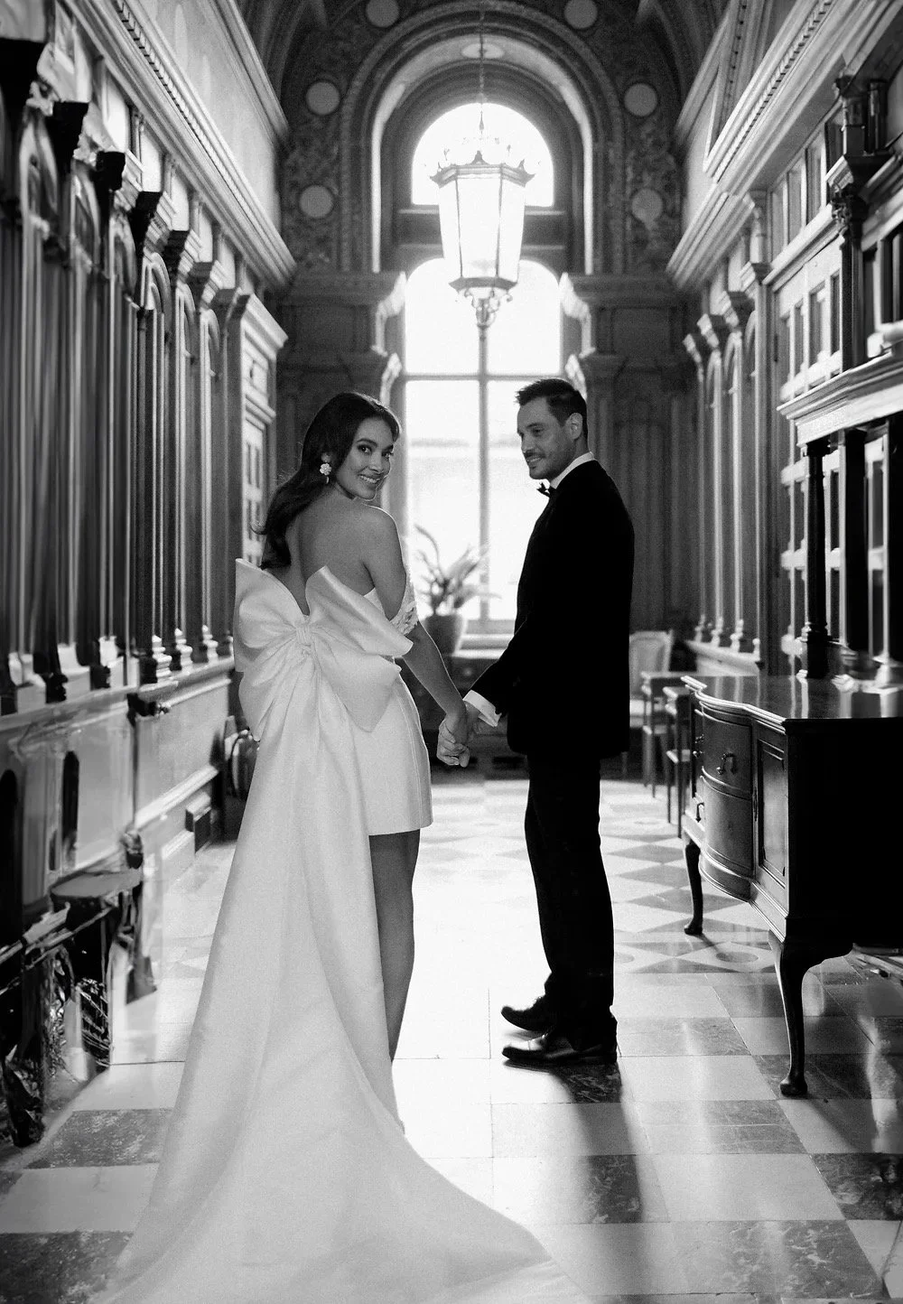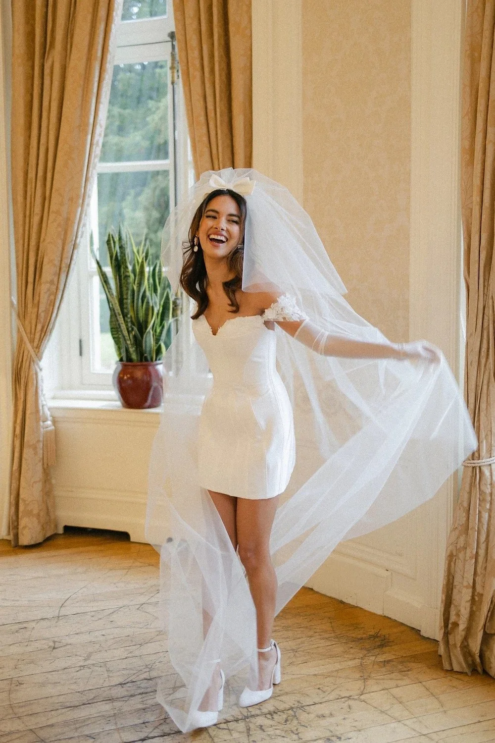 Looking for a statement wedding dress? Turn heads in MIMI. This short corseted gown features a detachable oversized bow for a dramatic touch. The gown is enhanced with beaded lace bust and straps for an added touch of elegance.