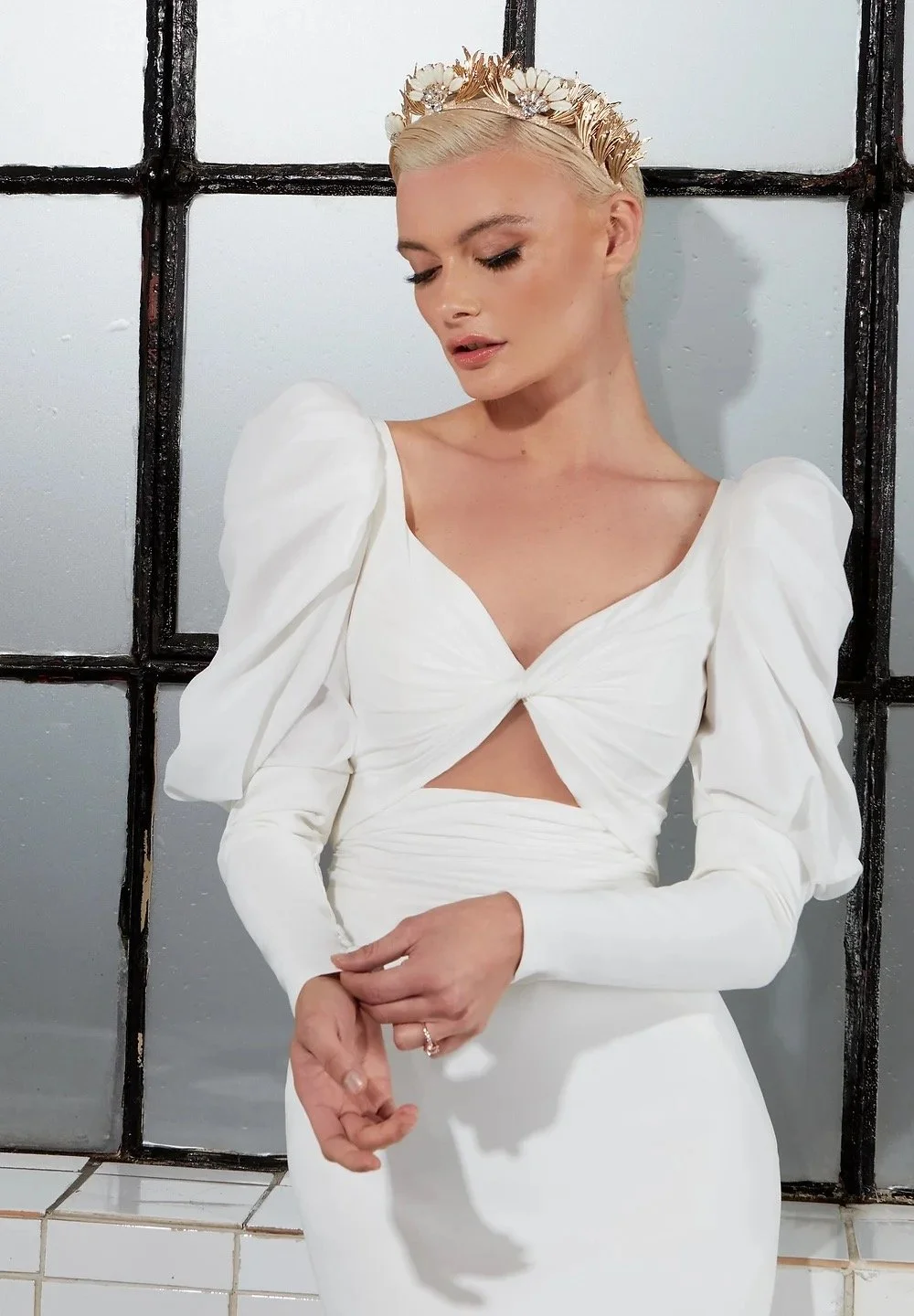 FALLON is the perfect choice for modern brides who want to make a statement on their wedding day. The stylish twist neck and 80's inspired sleeves add a touch of glamour to the figure flattering lux crepe fabric. The dramatic key-hole back and train will ensure all eyes are on you as you walk down the aisle.