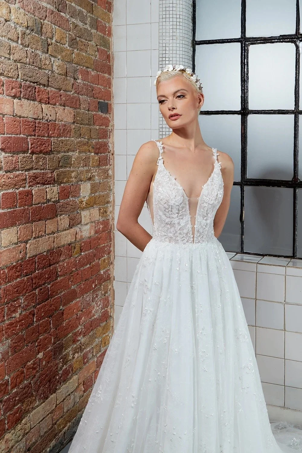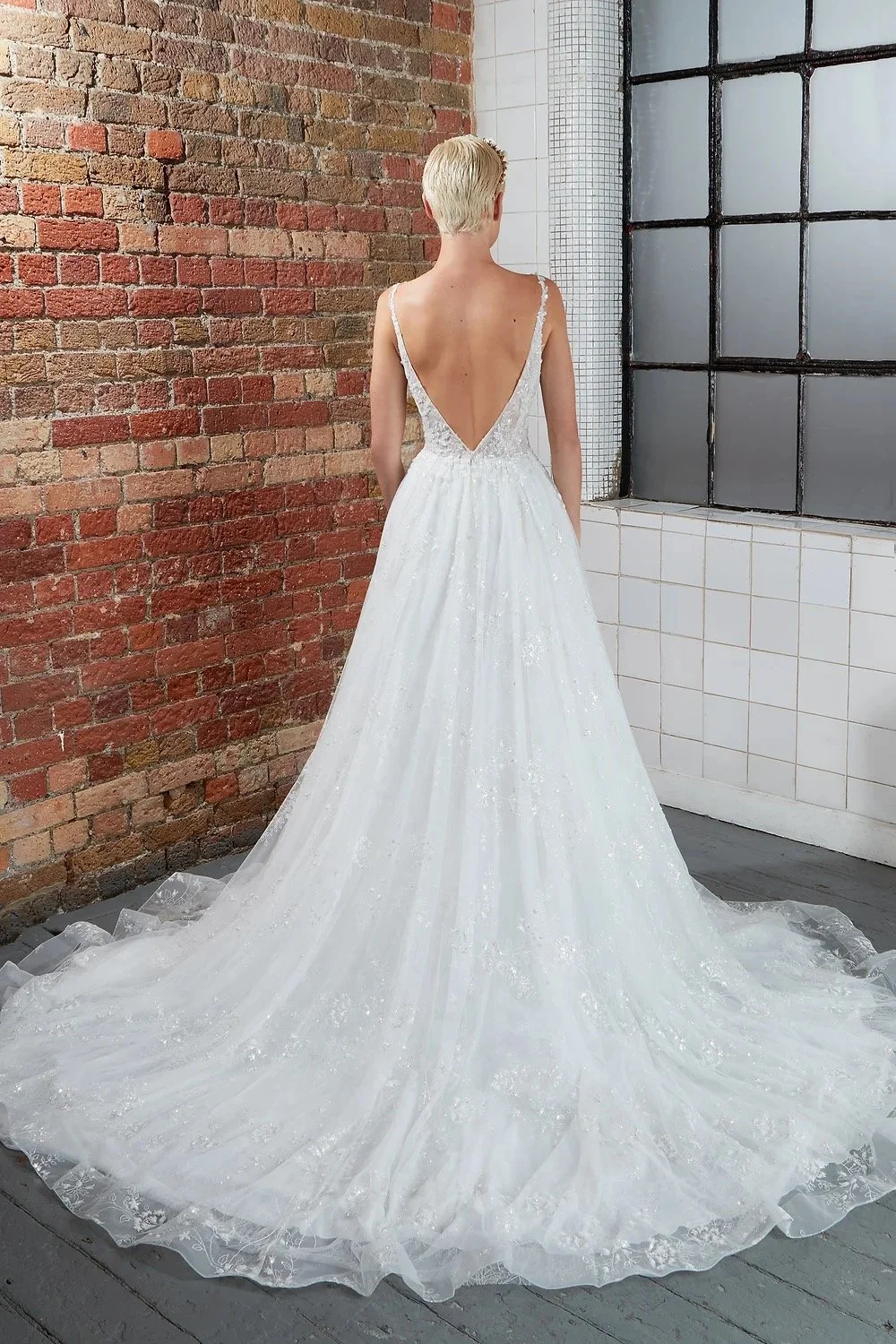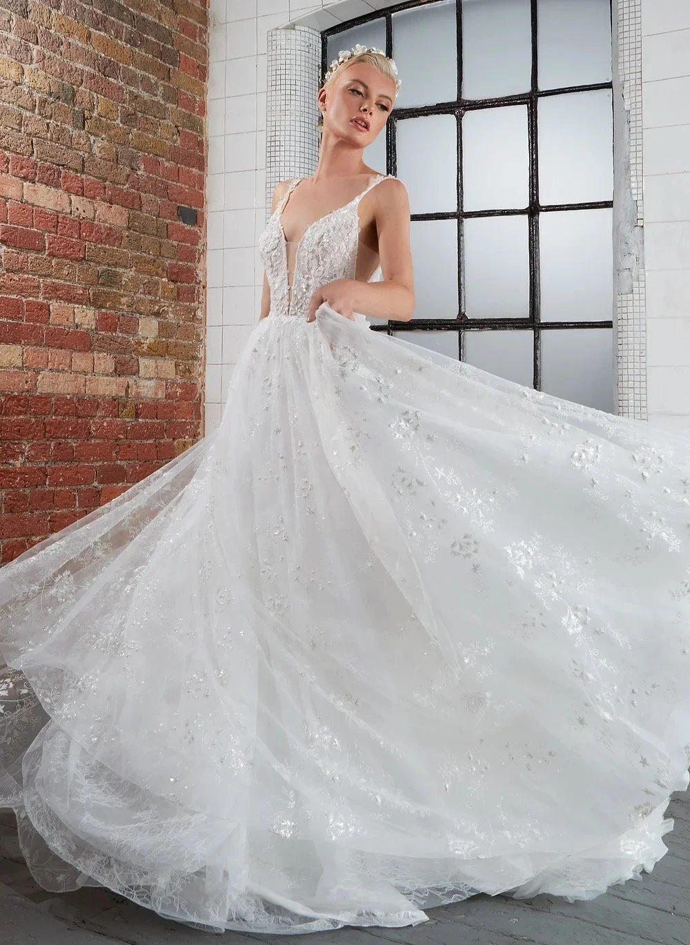 Introducing the stunning REESE wedding dress! This gorgeous gown features a flattering plunge V-Neck that accentuates the collarbone and elongates the neck. The full A-Line silhouette creates a stunning hourglass shape, and the stylish layered sparkle and beaded lace add a touch of glamour and elegance. The low back adds a hint of allure, making this dress perfect for the modern bride who wants to make a statement on her big day.