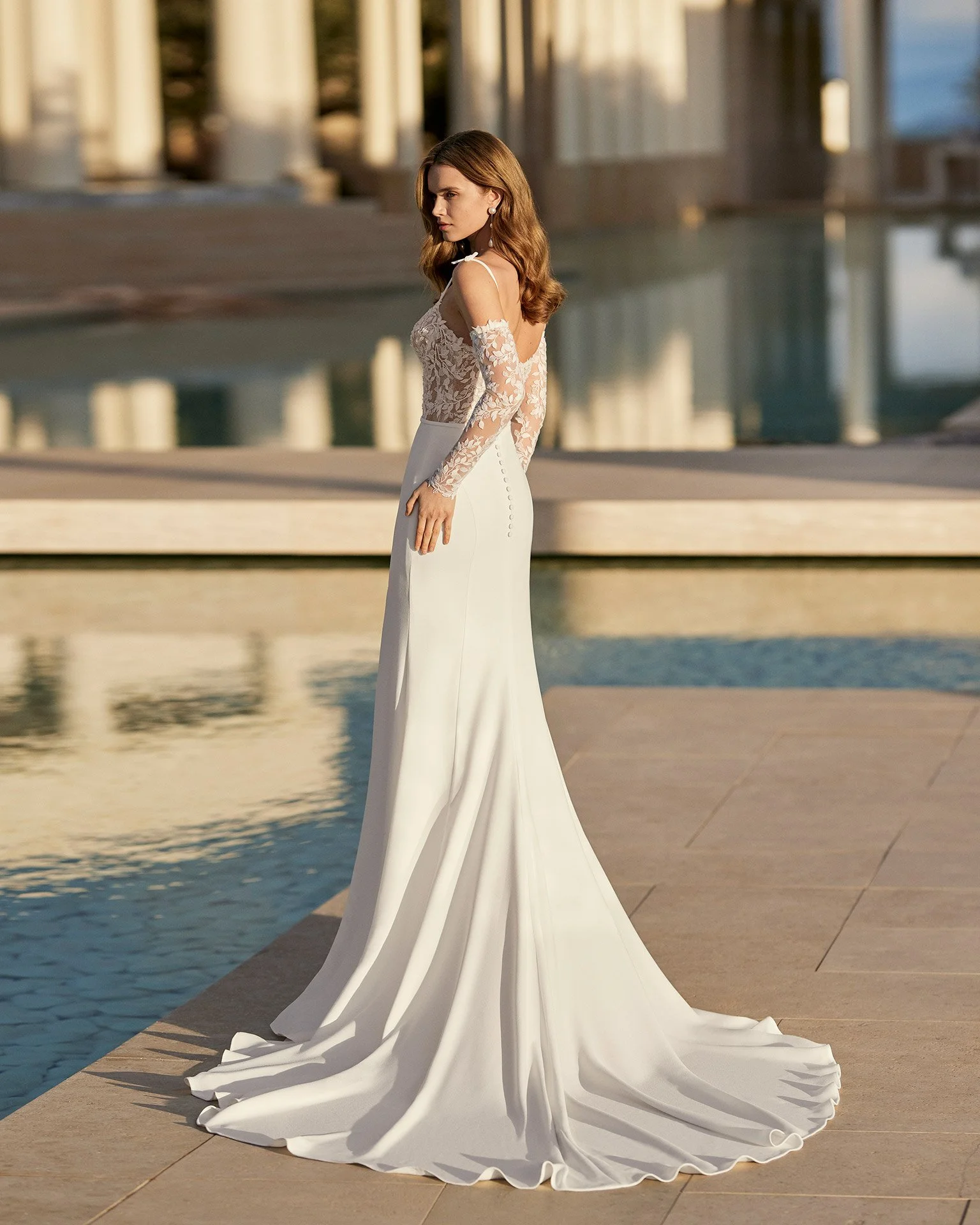 Sheath-style wedding dress with a slit, made of stretch crepe, lace and beadwork, with a corset structure and detachable sleeves.