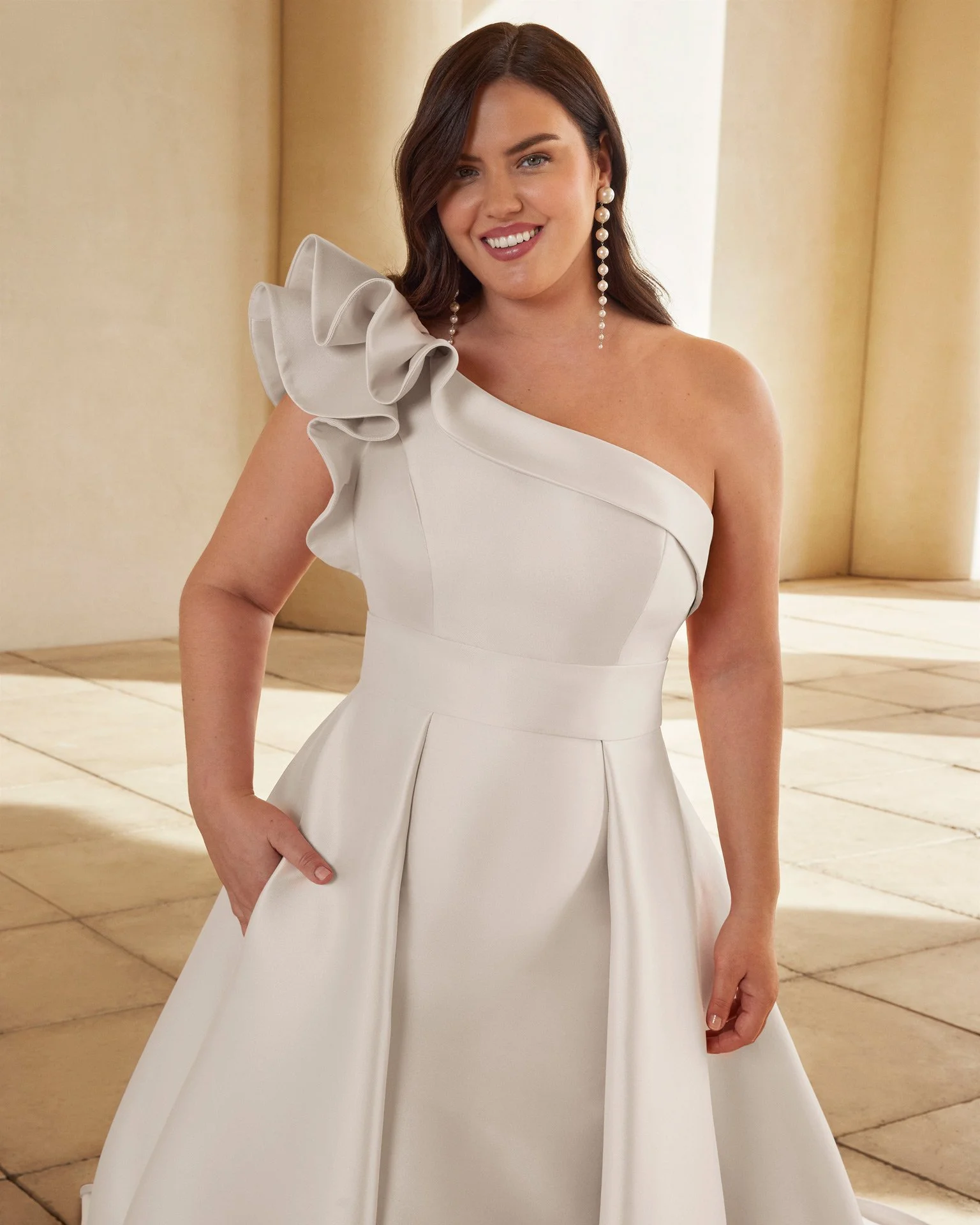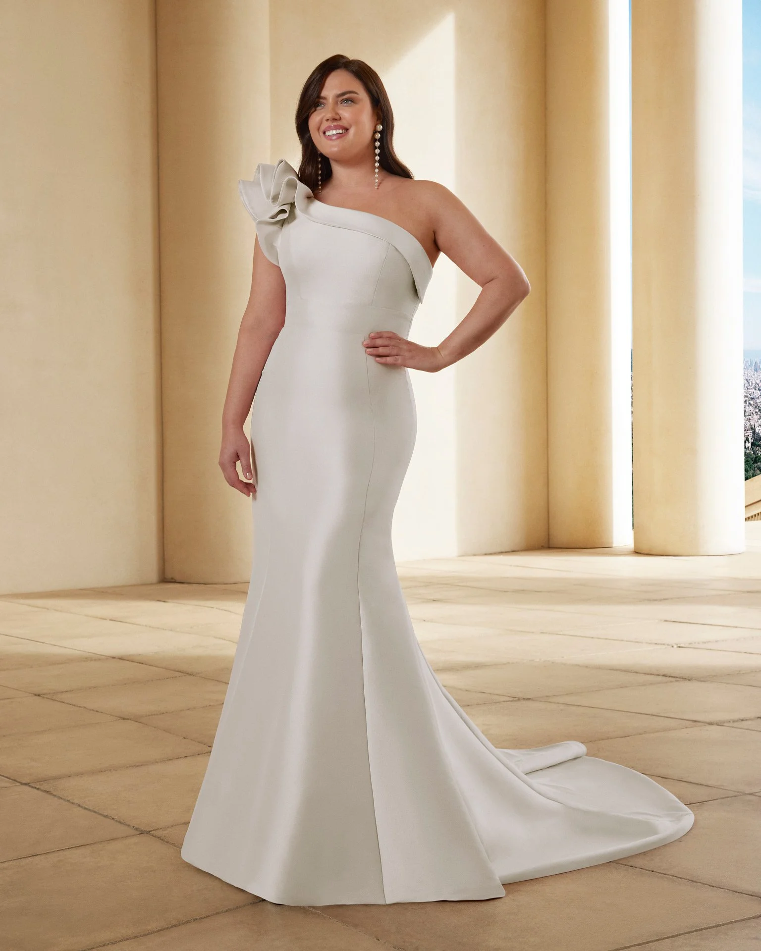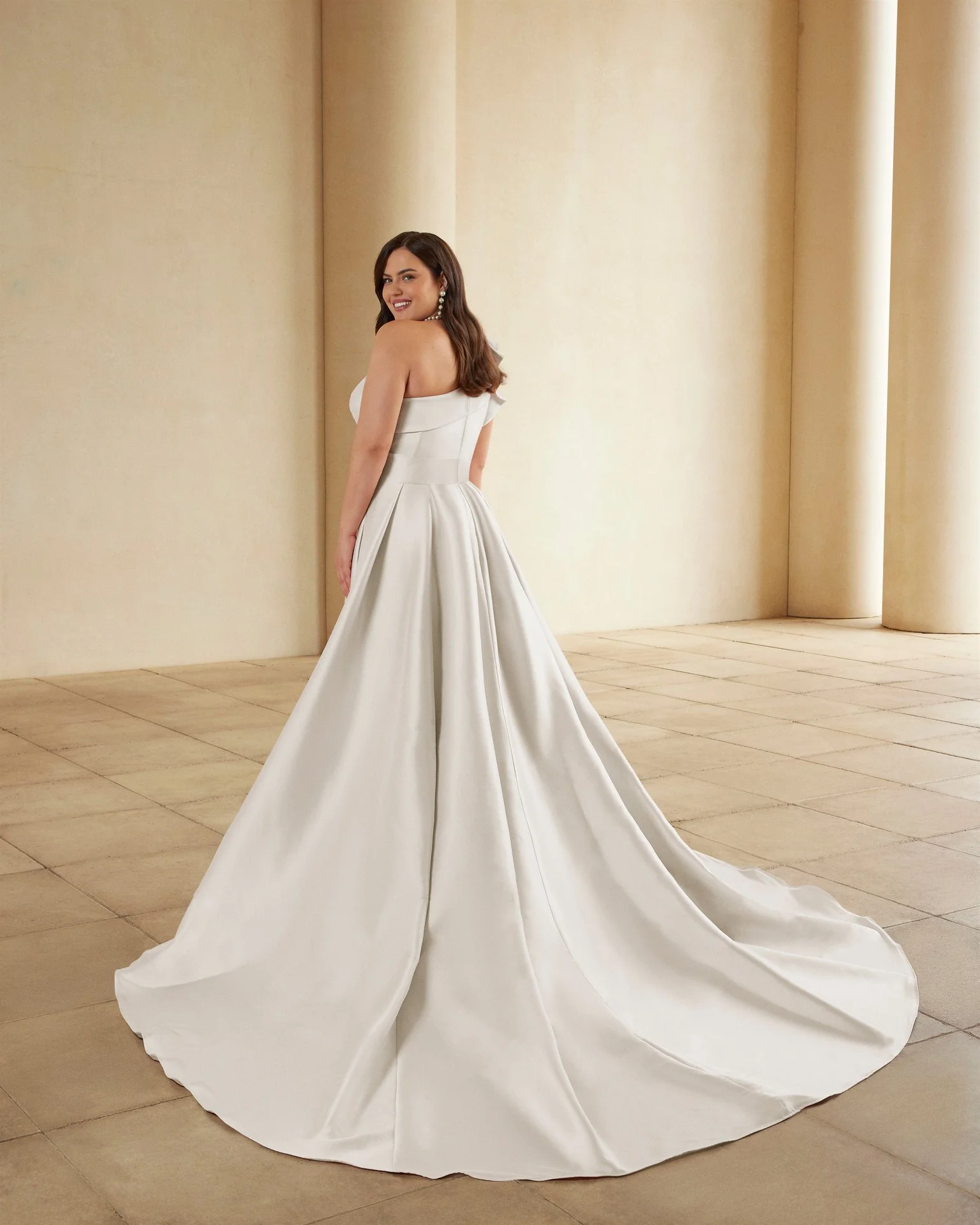 Modern two-piece mermaid wedding dress, made in mikado. Featuring an asymmetric neckline, open back and overskirt.