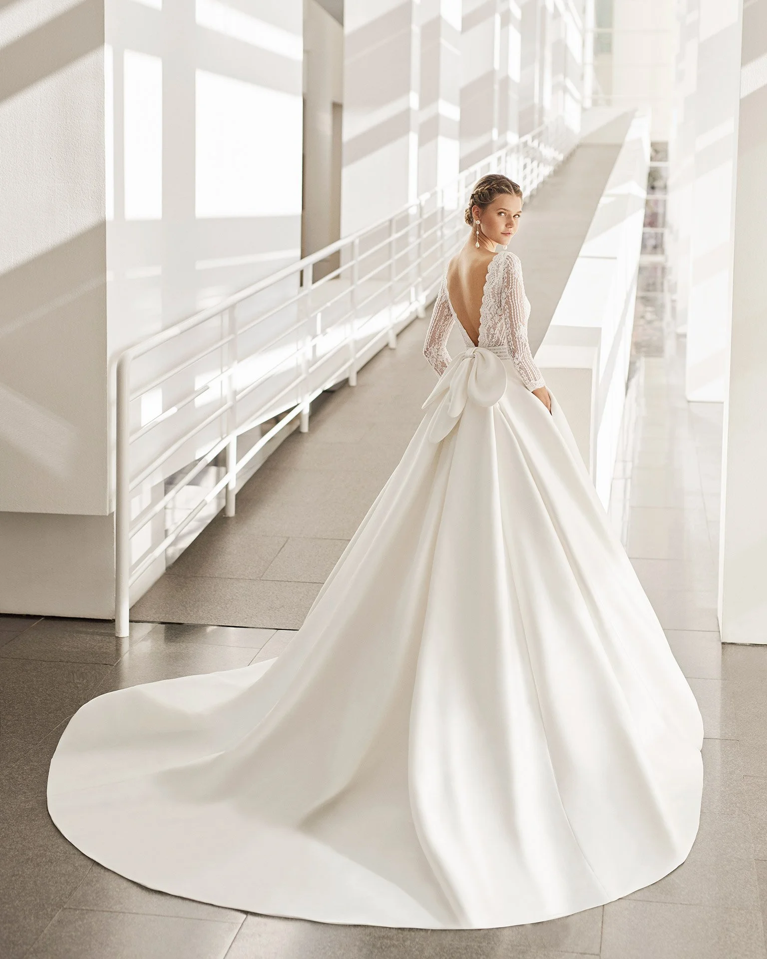 Rosa Clará | Nora Classic wedding dress; with a bateau neckline in Sienna lace and beadwork with a V-back with sleeves and a bow. Slide 1 Slide 1 (current slide) Slide 2 Slide 2 (current slide) Slide 3 Slide 3 (current slide)