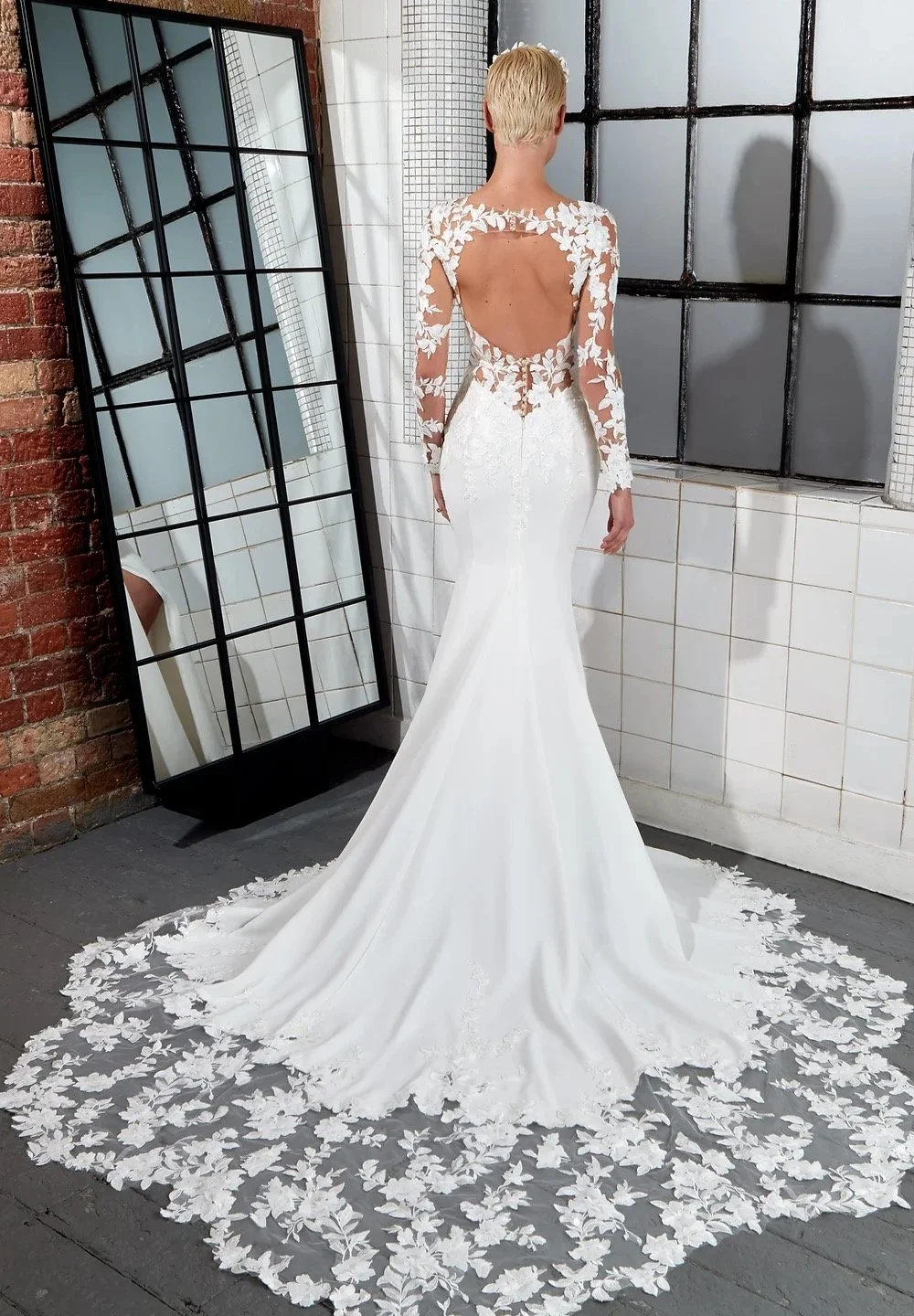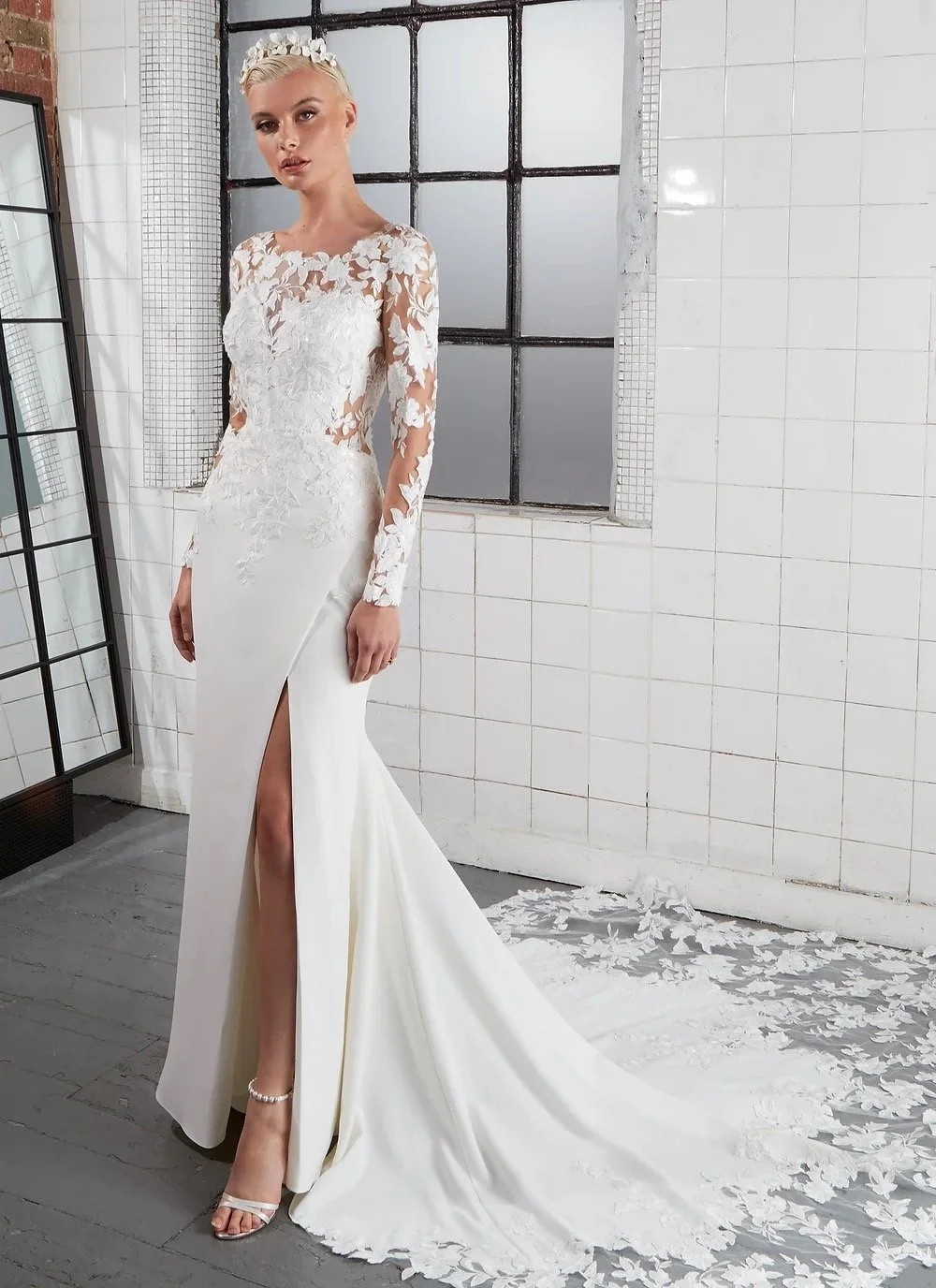 The QUINN is what modern dreams are made of! Crafted from luxurious crepe, this breathtaking dress features a flattering fishtail silhouette that effortlessly hugs your curves. The illusion neckline and key-hole back, adorned with modern lace detailing, add a touch of elegance that will leave you feeling like a true queen on your special day. A daring thigh split adds a sexy twist to the design, while the detachable bow allows for versatility and personalised style.