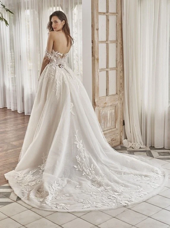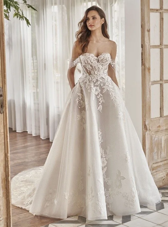 If you want to feel like you have just stepped into a real-life fairytale, ARIES is for you. This magnificent ball gown showcases a classic sweetheart neckline completed by a corset style bodice and eye-catching, detachable off-the-shoulder tulle and lace straps that beautifully criss-cross in the back. This dress is comprised of floral embroidered lace, glitter tulle, organza, stretch chiffon, and tulle. These seamlessly blend together with the floral detailing to create the most sensational gown.