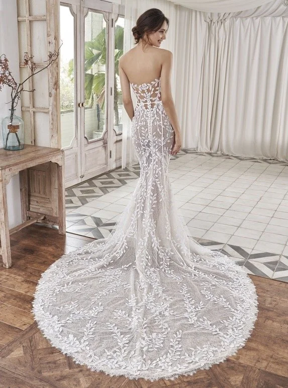 Be the star of the show in ASPEN. This high-fashion crafted gown with Chantilly lace and tulle, will have you looking lavish. The beaded embroidered vine motifs are a bold yet refined statement sure to draw attention. The corset-style bodice adds in a sexy touch with its sweetheart neckline and side cut-outs, while sweet trim detailing helps cinch the waistline and flatter the figure. ASPEN is the perfect mermaid gown for the bride wanting a delicate and effortlessly chic look.