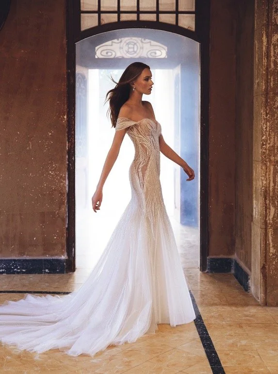 AUGUSTINE is a contemporary mermaid gown for the modern bride. The beaded linear lace is a unique touch that will be sure to turn heads on your wedding day. Tie in the romance with the plunging sweetheart neckline and then mix it up with its sexy corset bodice and dreamy, detachable off-the-shoulder tulle straps. This mermaid gown will be sure to accentuate your best features. The skirt is a blend of glitter tulle and stretch chiffon pulling it all together into a showstopping gown.