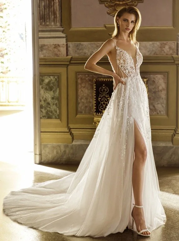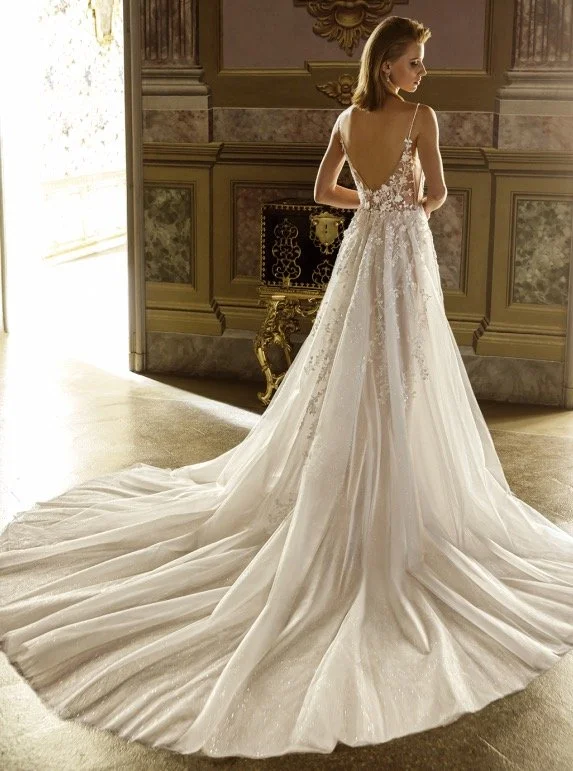BENNETT is a romantic A-line silhouette gown that glimmers with beaded 3D floral motifs and delicate 3D floral crepe petals. The skirt creates an ethereal feel by combining sparkling glitter tulle, soft tulle, and a semi-sheer organza lining. BENNETT’s beautiful bodice features a deep V-neckline and illusion side cut-outs to cinch the waist which is brought together by a sweet and delicate bow detail.