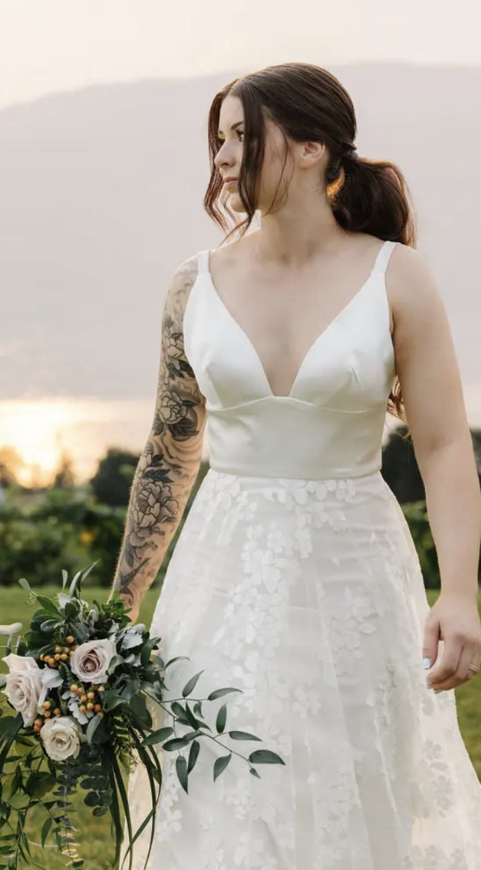 Bridgid pays homage to the classic silhouette, with its sophisticated design and luxurious details. The softness and sophistication of the lace adds a sculptural element to the gown, while the wide waistband accentuates your curves with grace. With its plunging V-neckline, the Bridgid seamlessly blends elegance and practicality, making it the perfect choice for a bride who wants a modern with a touch of romance.