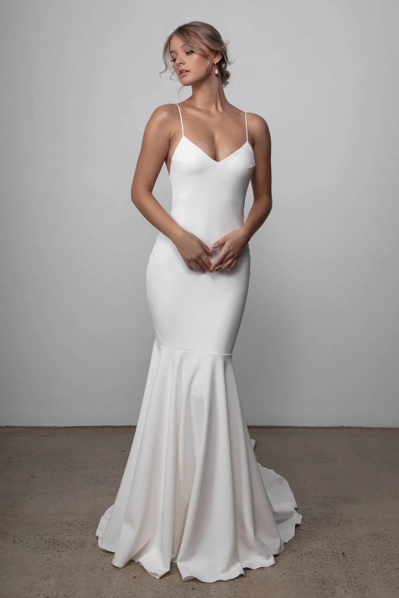 Clo-crepe speaks a softer language. The crepe wedding dress features centre-back ruching paired with a mermaid silhouette that defines pared back drama. A distinctive and luxurious feel is evoked through Clo’s decadent stretch crepe that transcends minimal elegance.