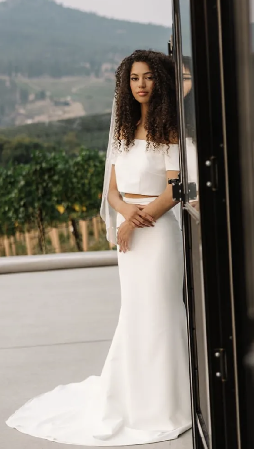 Introducing our alluring off-the-shoulder wedding separate top, the Alba. This short-sleeved crop top, made from exquisite crepe fabric, combines modern elegance with a playful touch. The “Alba” top features an off-the-shoulder neckline that beautifully highlights your collarbones, while the cropped length adds a contemporary twist. Crafted for both comfort and style, the “Alba” is the perfect choice to elevate your bridal ensemble.